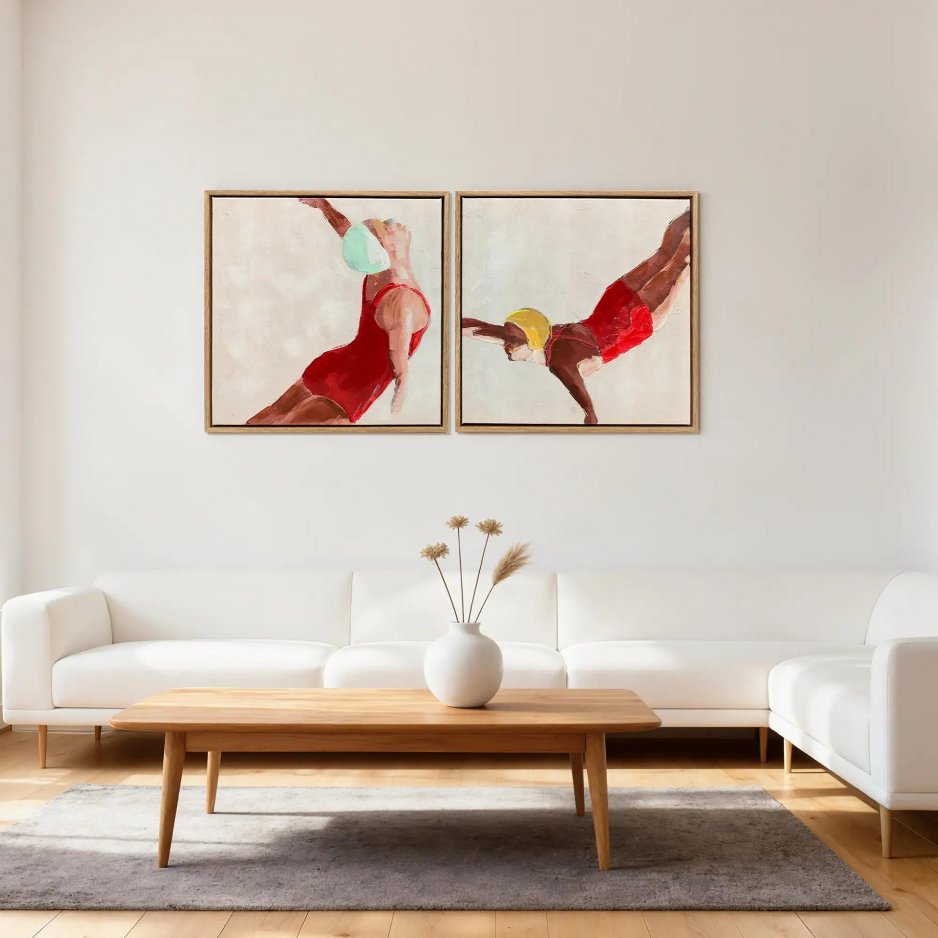 - CONJUNTO DE ARTE MURAL DINÁMICO: Esta serie de dos cuadros en lienzo captura nadadores abstractos en bañadores rojos, moviéndose con elegancia sobre un fondo neutro y texturizado. Las pinceladas audaces y colores cálidos infunden energía y sofisticación moderna en cualquier ambiente contemporáneo.