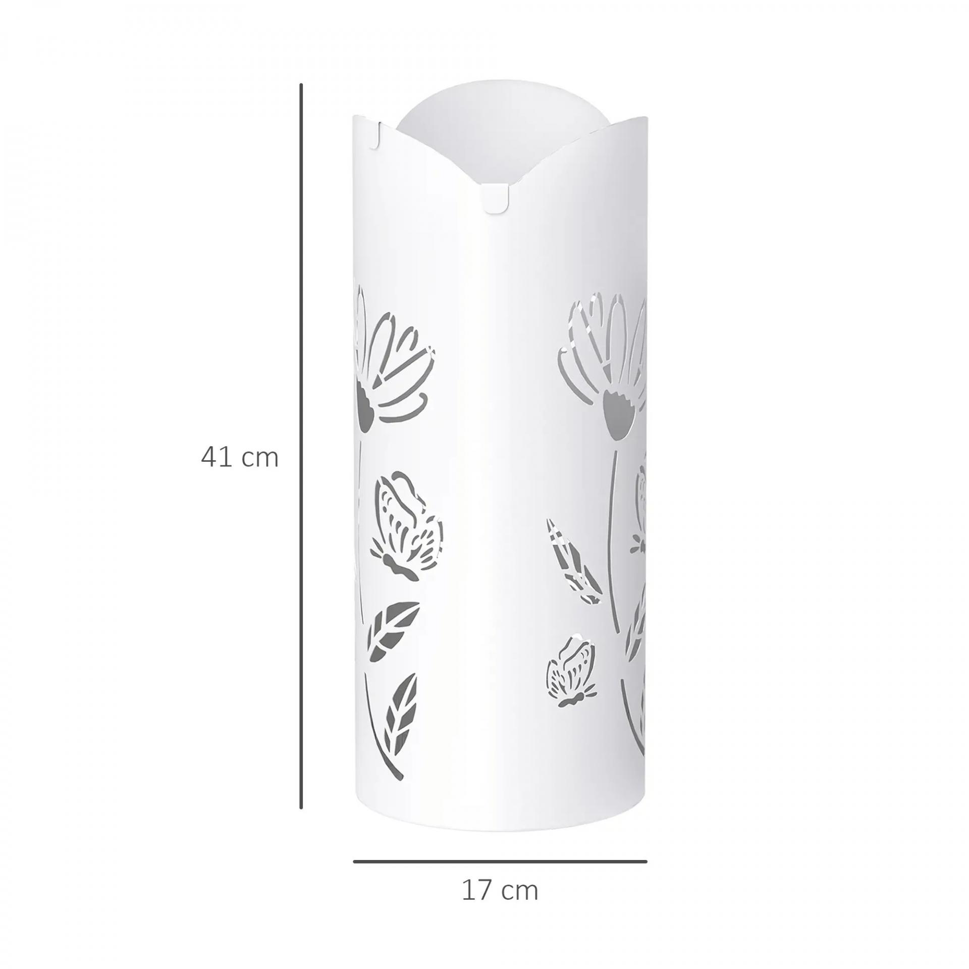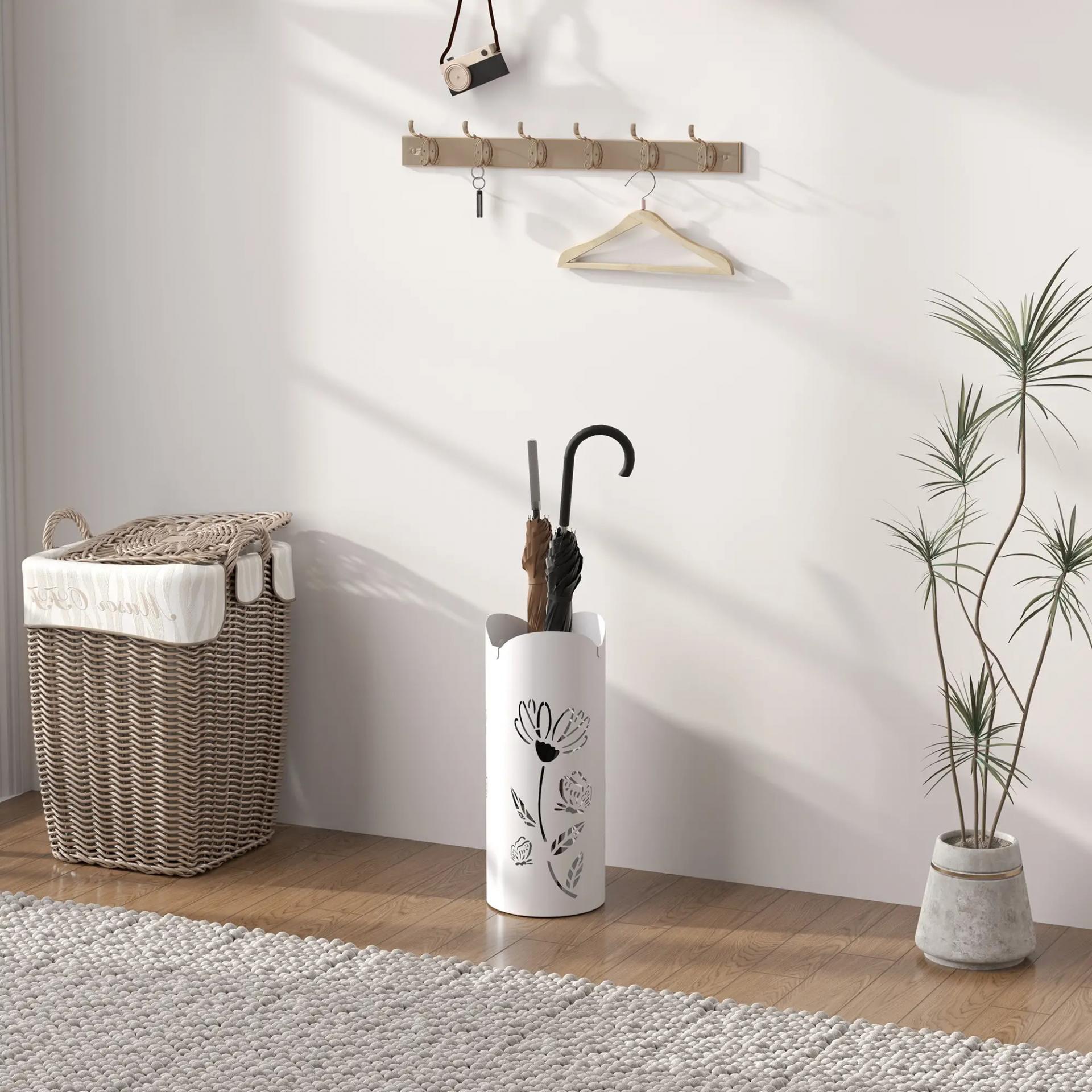 Paragüero de Acero con 4 Ganchos y Bandeja de Goteo Extraíble y Diseño Decorativo 17x17x41 cm Blanco