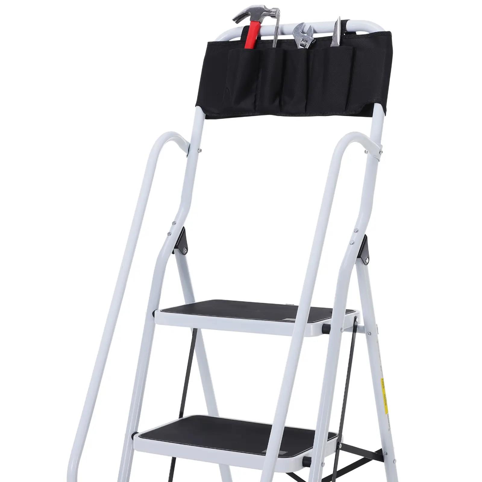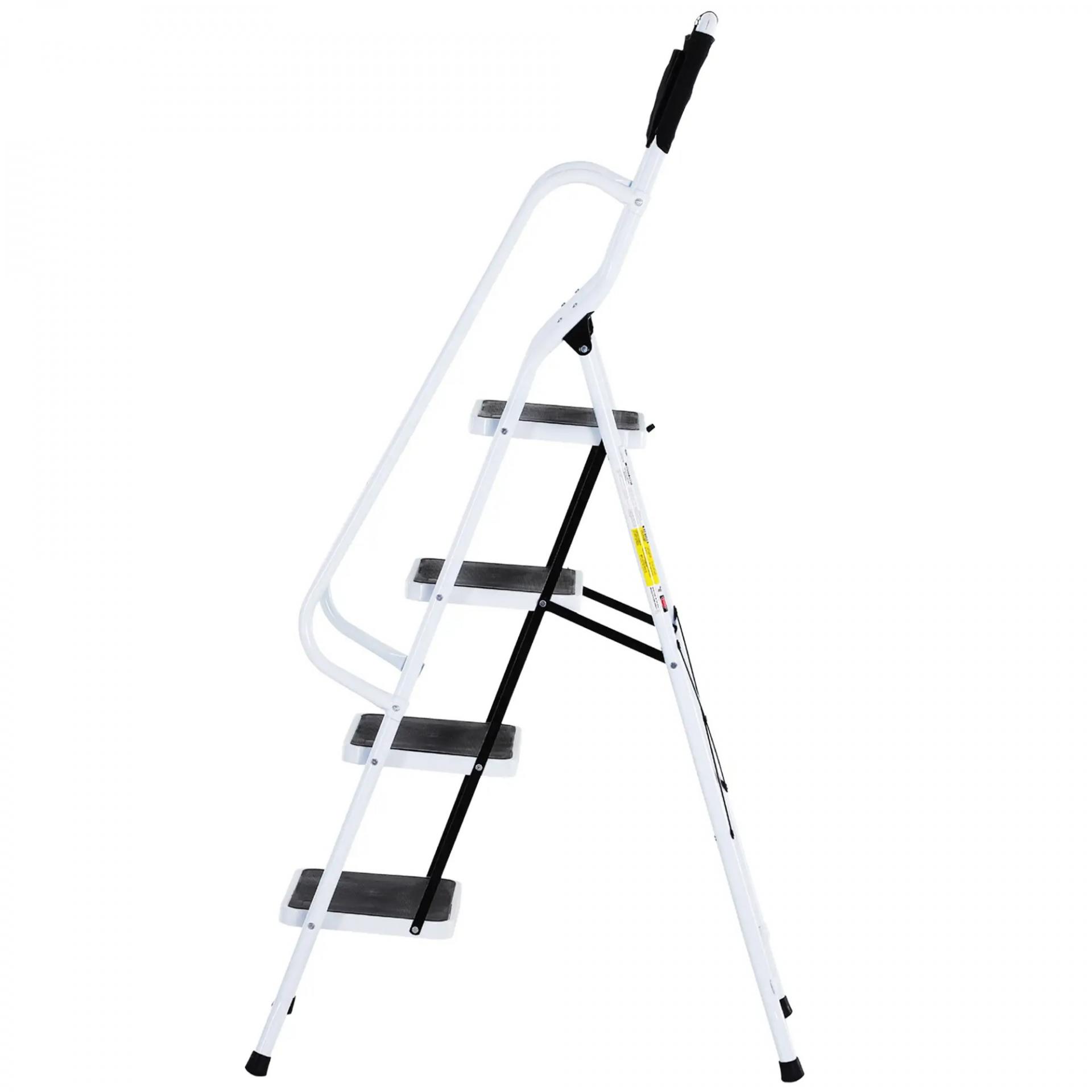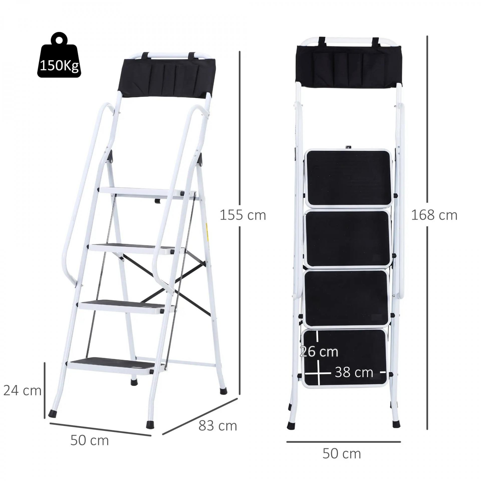 Escalera Plegable de 4 Peldaños Escalera de Tijera con Apoyabrazos y Portaherramientas 50x83x155 cm Blanco y Negro