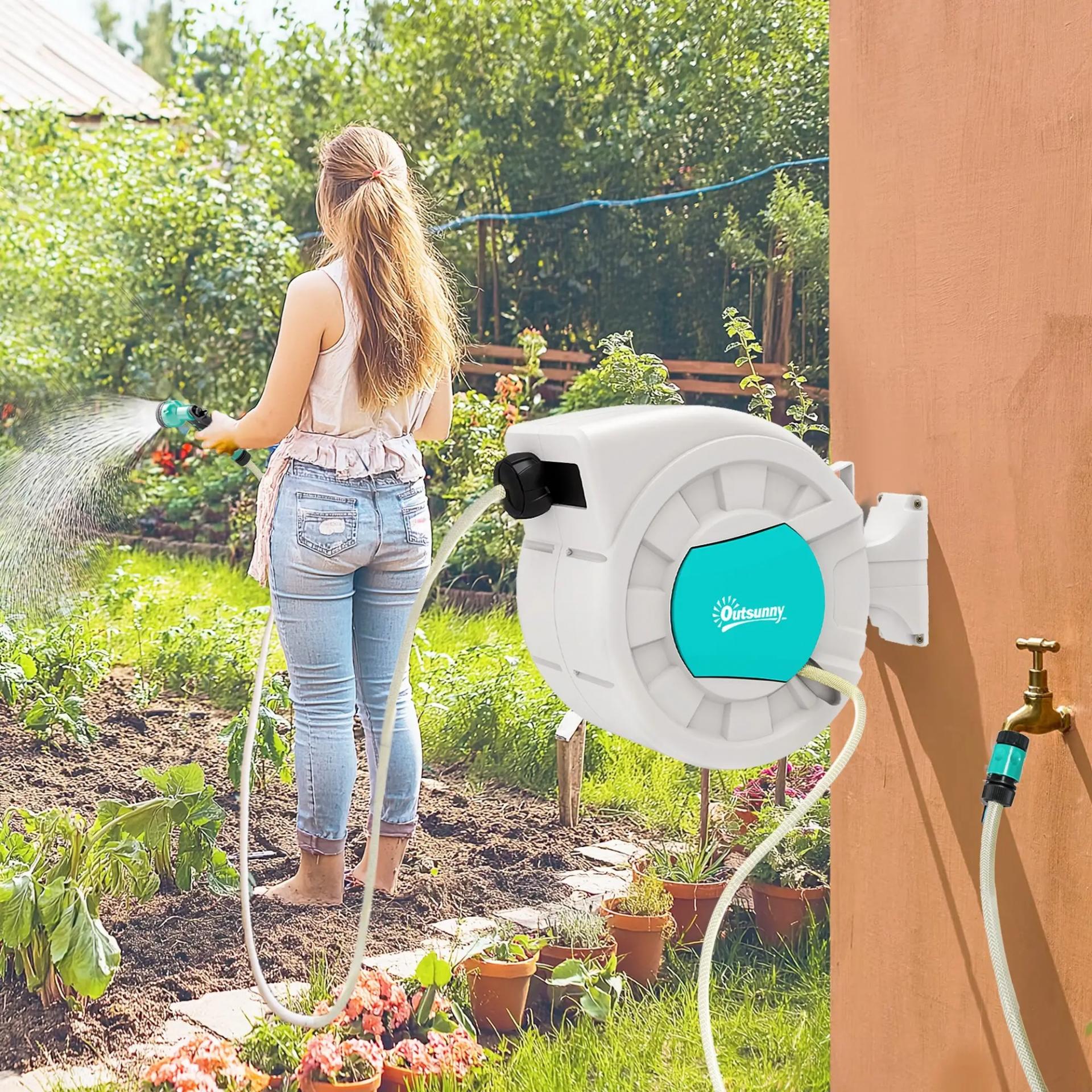 Manguera Retráctil de Pared con Carrete de 25+2 m con Bloqueo Retorno Automático y Boquilla de 7 Funciones y Giro 180°