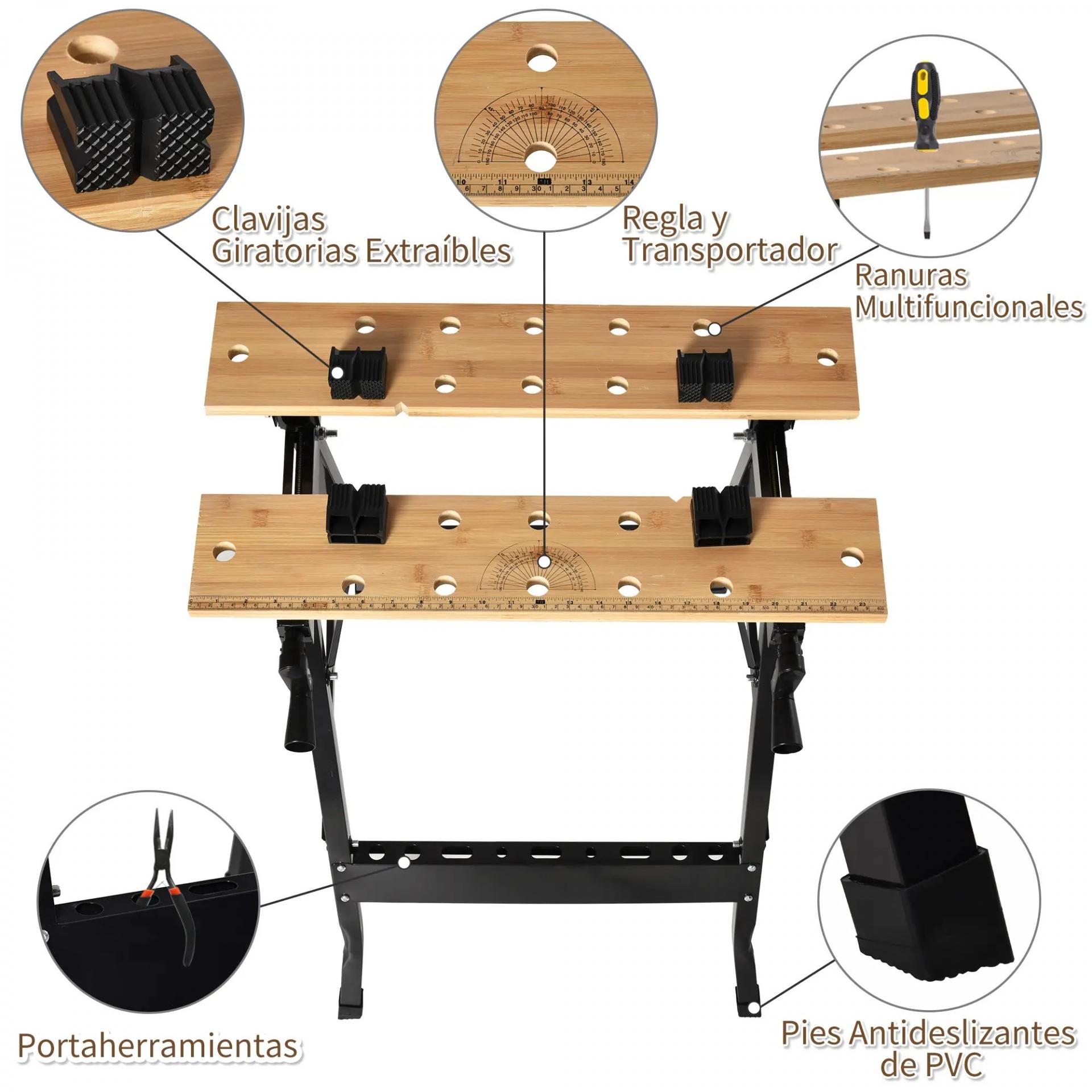 - BANCO DE TRABAJO RESISTENTE: Con estructura de acero galvanizado y dos tablas de bambú, puede soportar hasta 150 kg. Sus patas antideslizantes de PVC proporcionan mayor estabilidad y evitan rayones en el suelo. Tiene barras de unión entre las patas con muchas ranuras para colocar herramientas