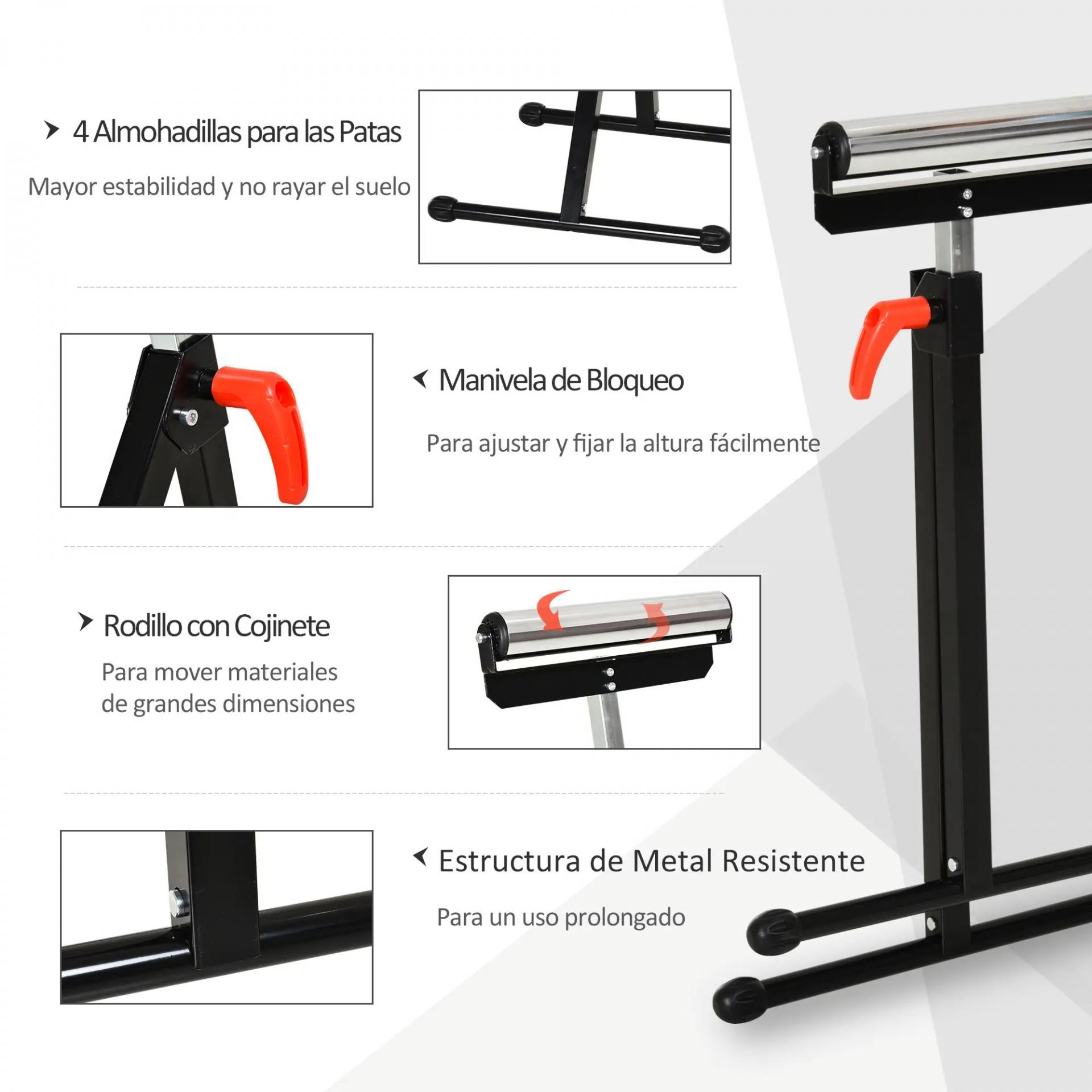 - CABALLETE DE APOYO CON RODILLO: De aplicación universal, es ideal para trabajos en madera y metal. Para aguantar y arrastrar piezas largas, voluminosas o pesadas sin esfuerzo mientras se manipulan ingletadoras, cepilladoras, etc.
