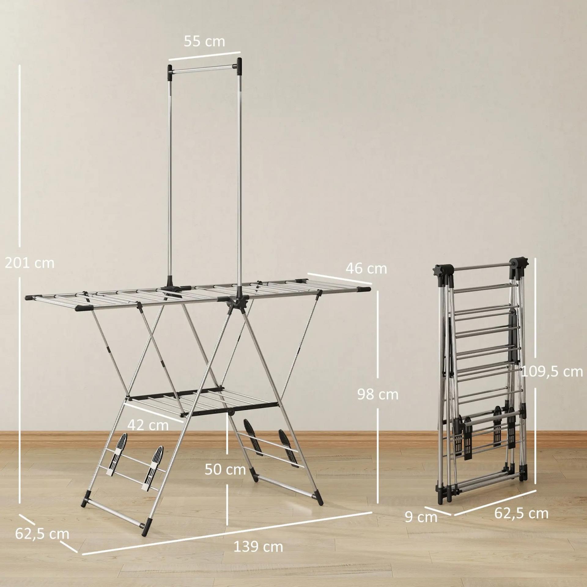 Tendedero Vertical Plegable con Alas Ajustables 4 Soportes para Calzado Barra y Estante 139x62,5x201 cm Plata