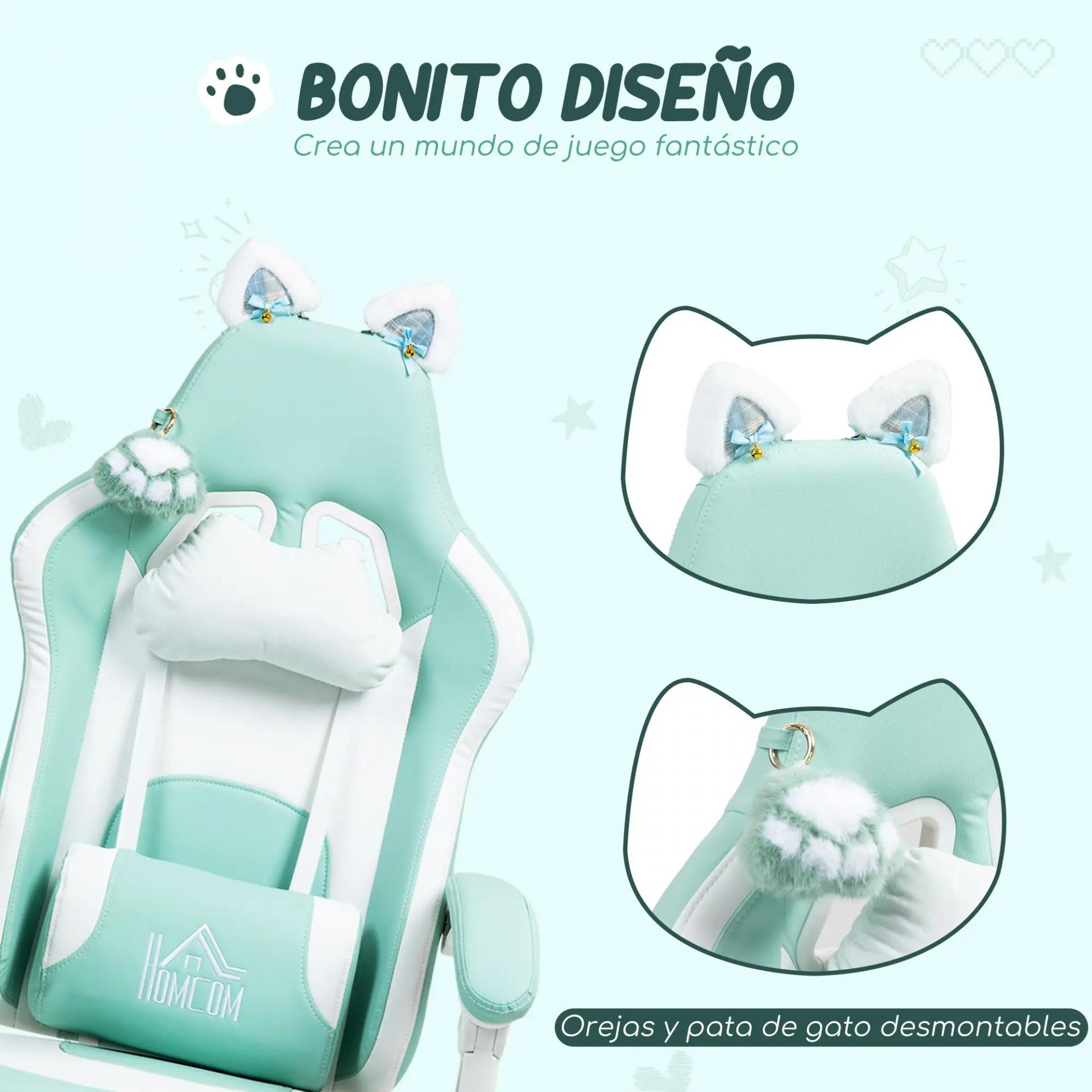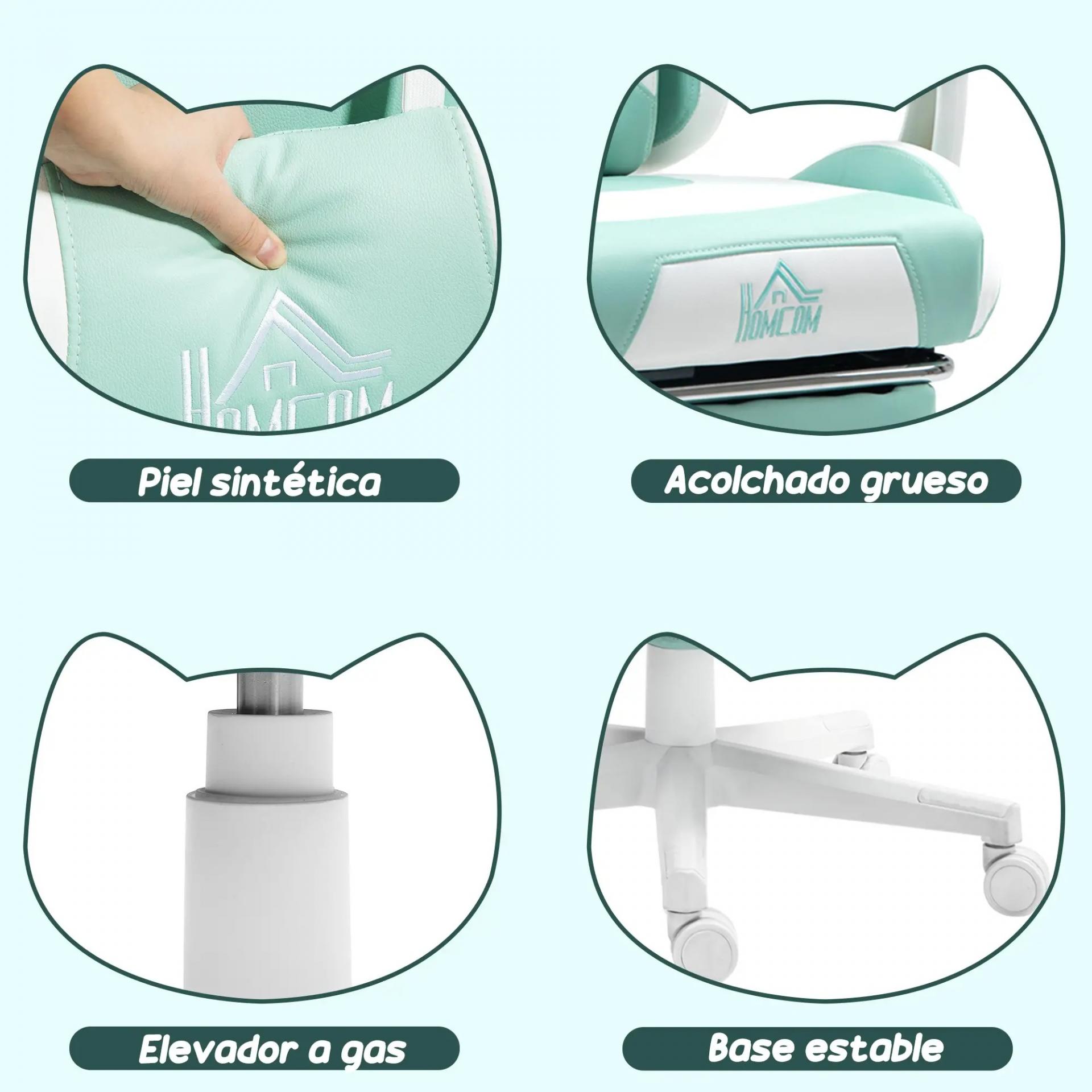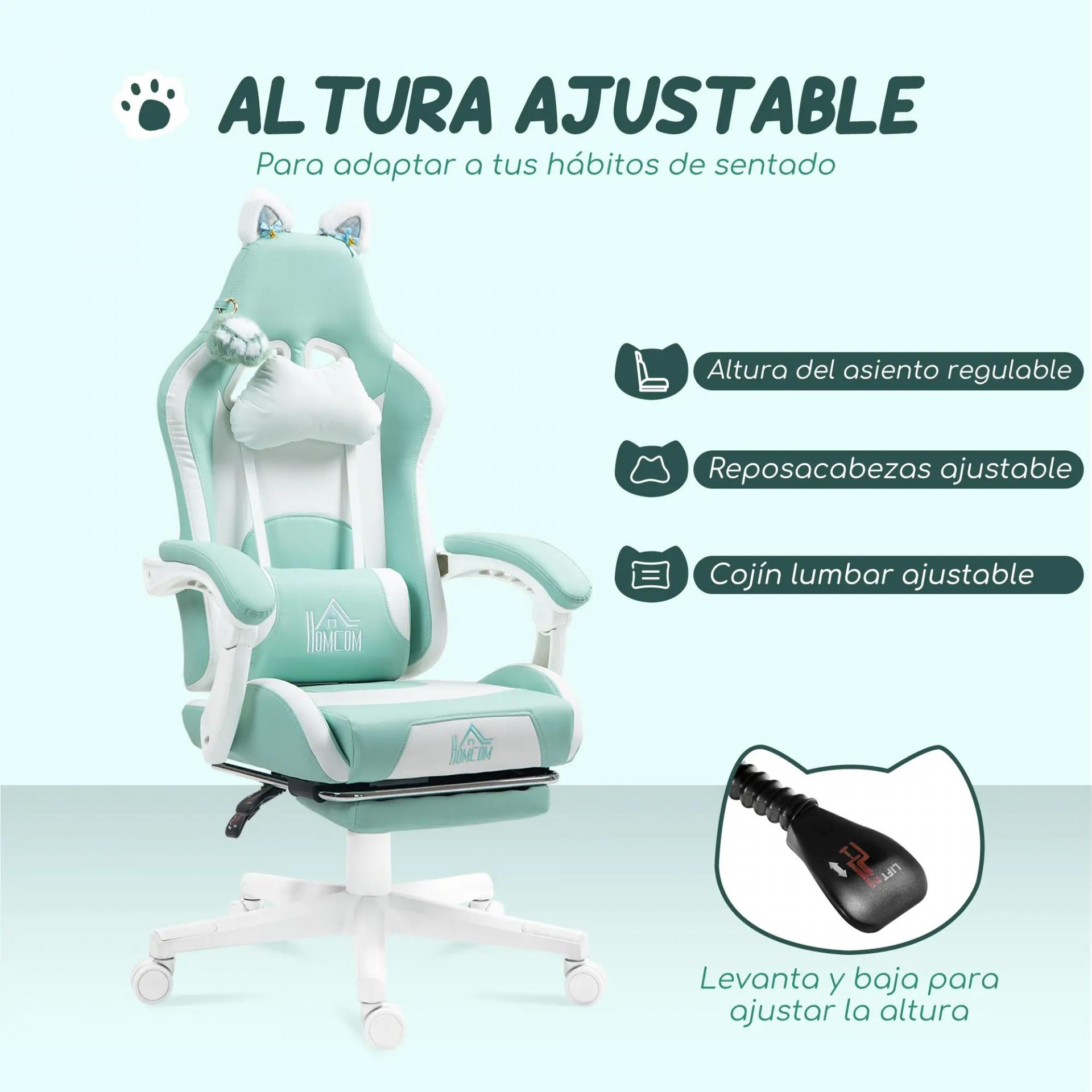 Silla Gamer Reclinable con Altura Ajustable Reposapiés Retráctil Soporte Lumbar y Reposacabezas Desmontable Verde Menta