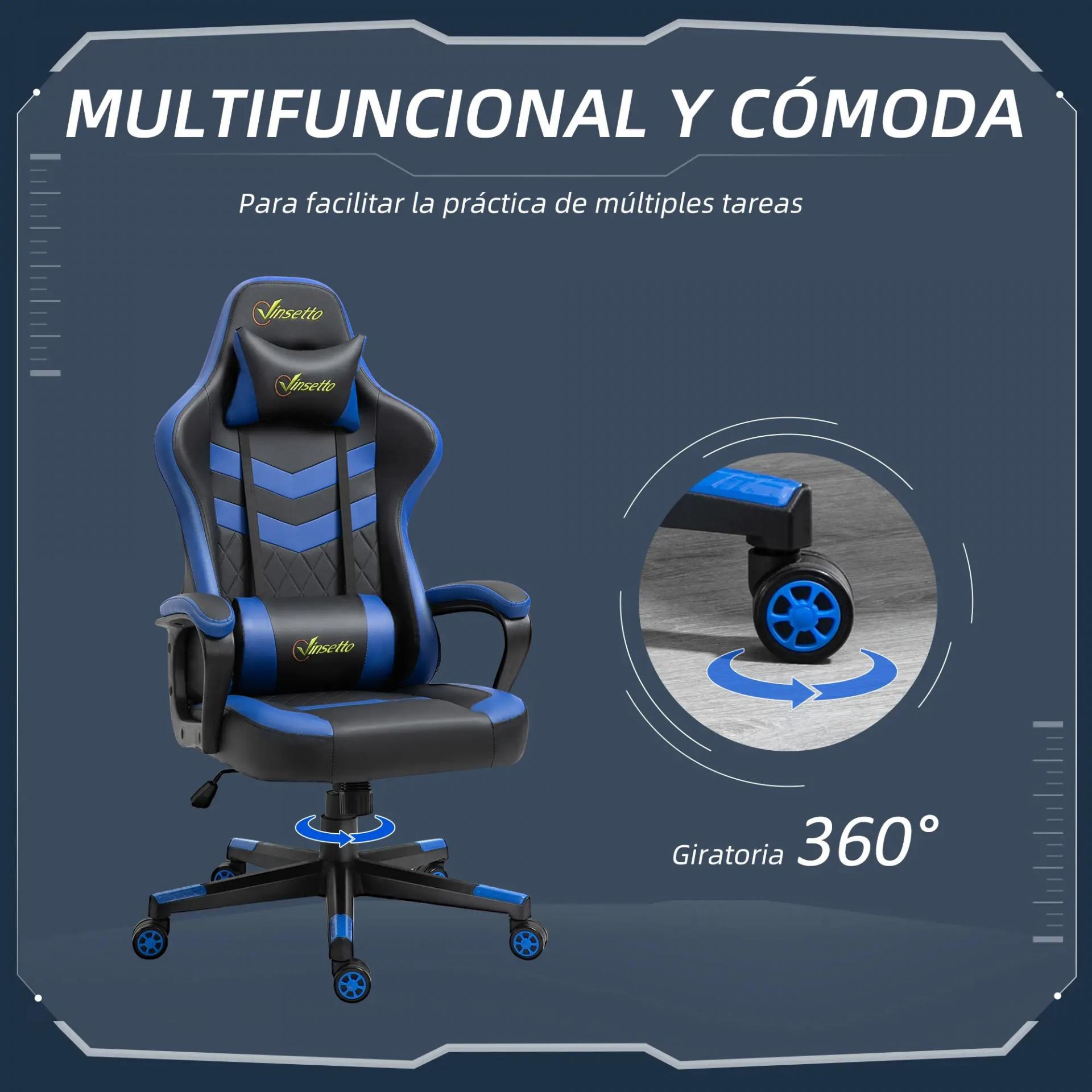 Silla Gaming Altura Regulable Basculante con Reposacabezas Cojín Lumbar 61x70x121-129 cm Azul