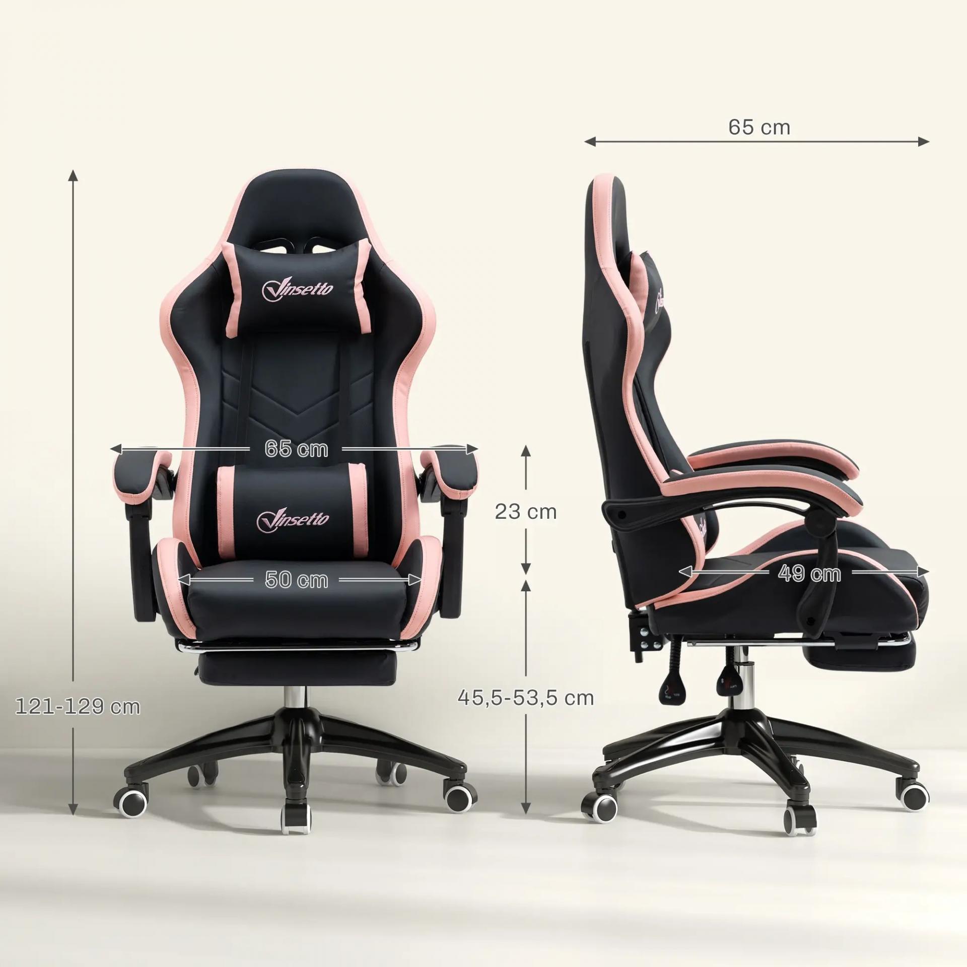 Silla Gaming Silla Gamer de Cuero PU Reclinable 135° Reposacabezas y Reposapiés 65x65x121-129 cm Negro y Rosa