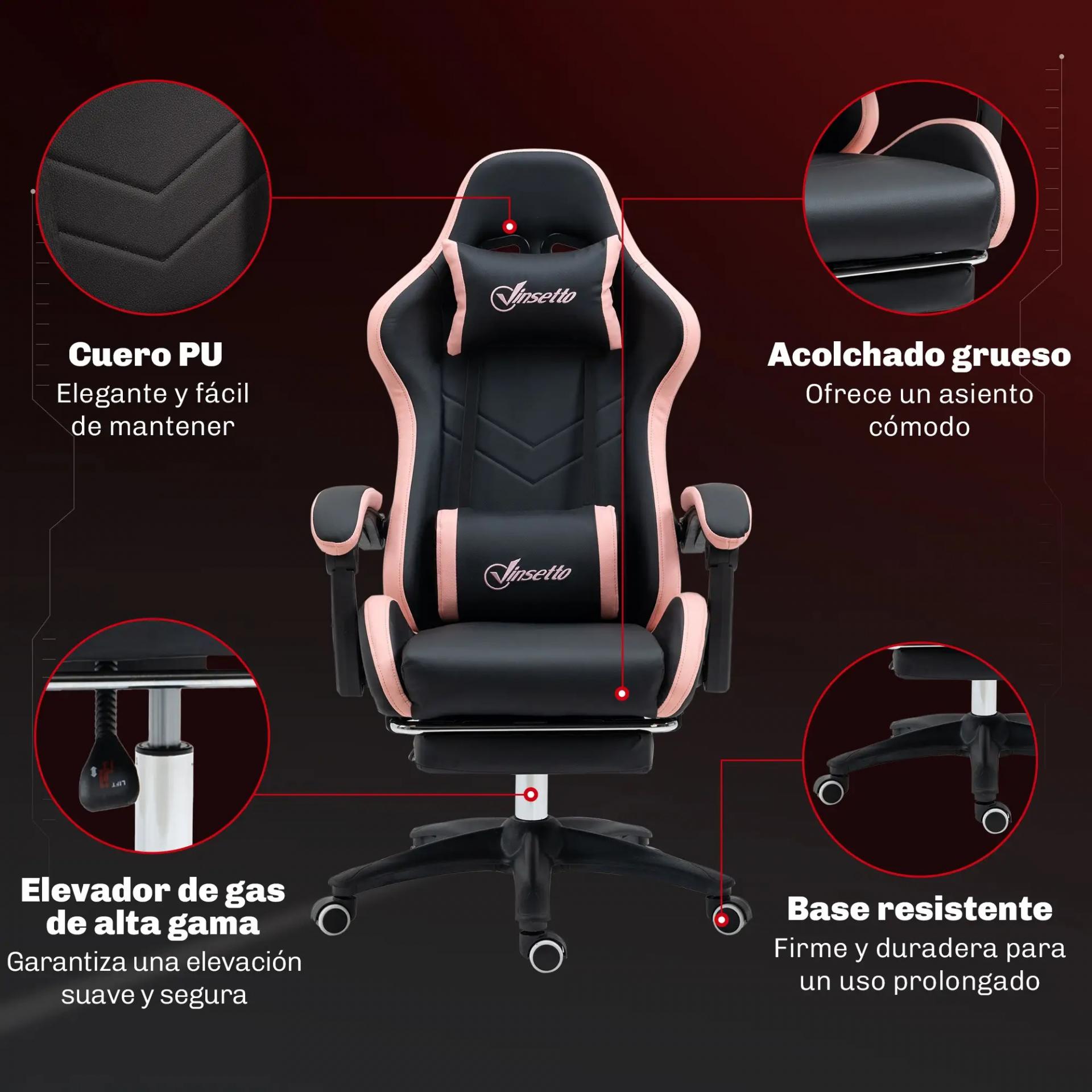 - SILLA GAMING DE PIEL SINTÉTICA: Silla de oficina con diseño gaming inspirado en los asientos de coches de carreras. Tapizada en piel sintética negra con detalles rosas, ofrece un estilo deportivo y ergonómico ideal para largas sesiones de uso