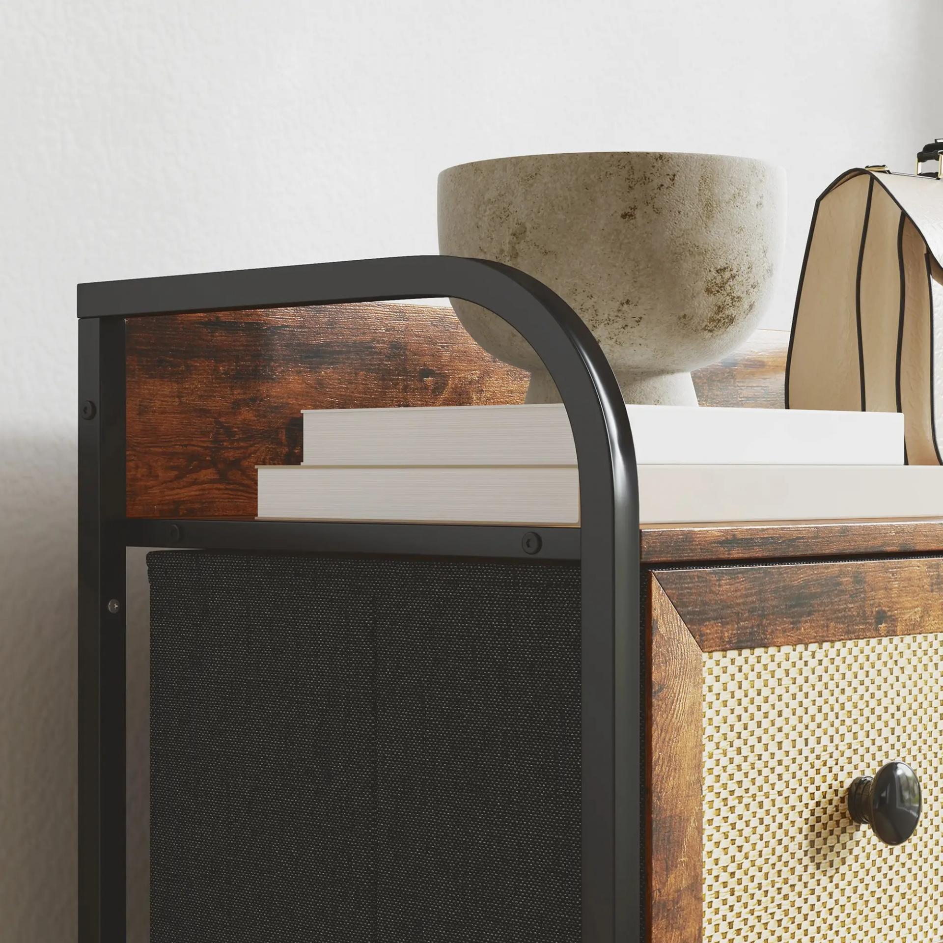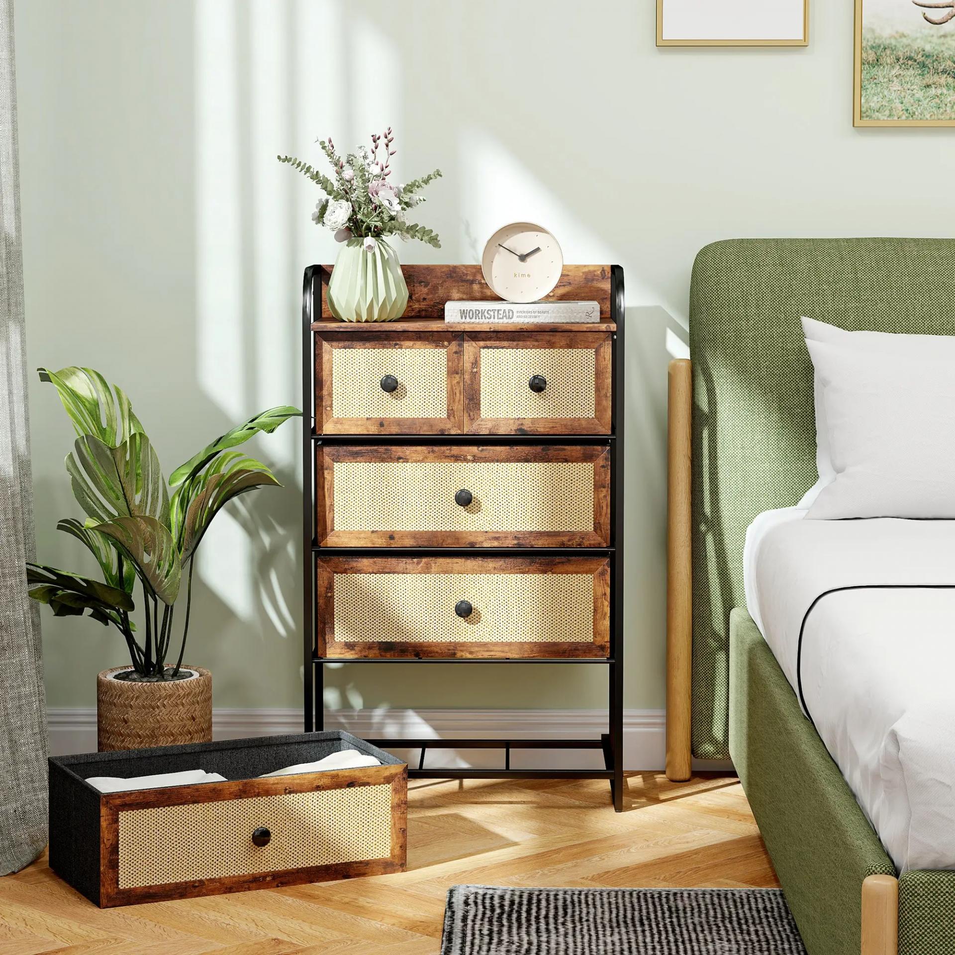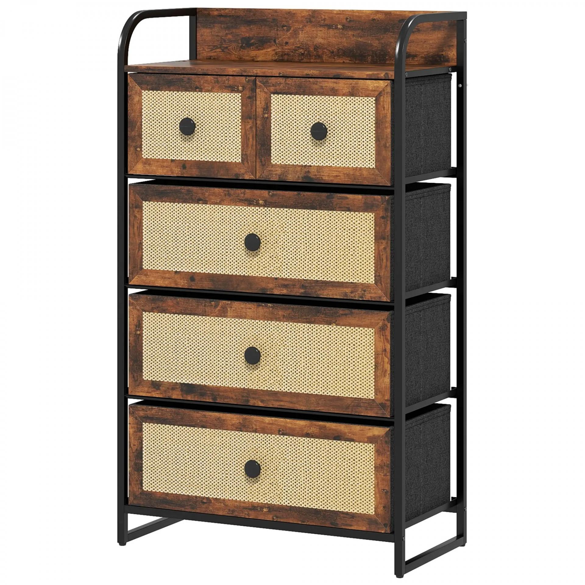 Cómoda para Dormitorio con 5 Cajones con Frentes de Ratán y Marco de Acero 58x29x99 cm Marrón Rústico