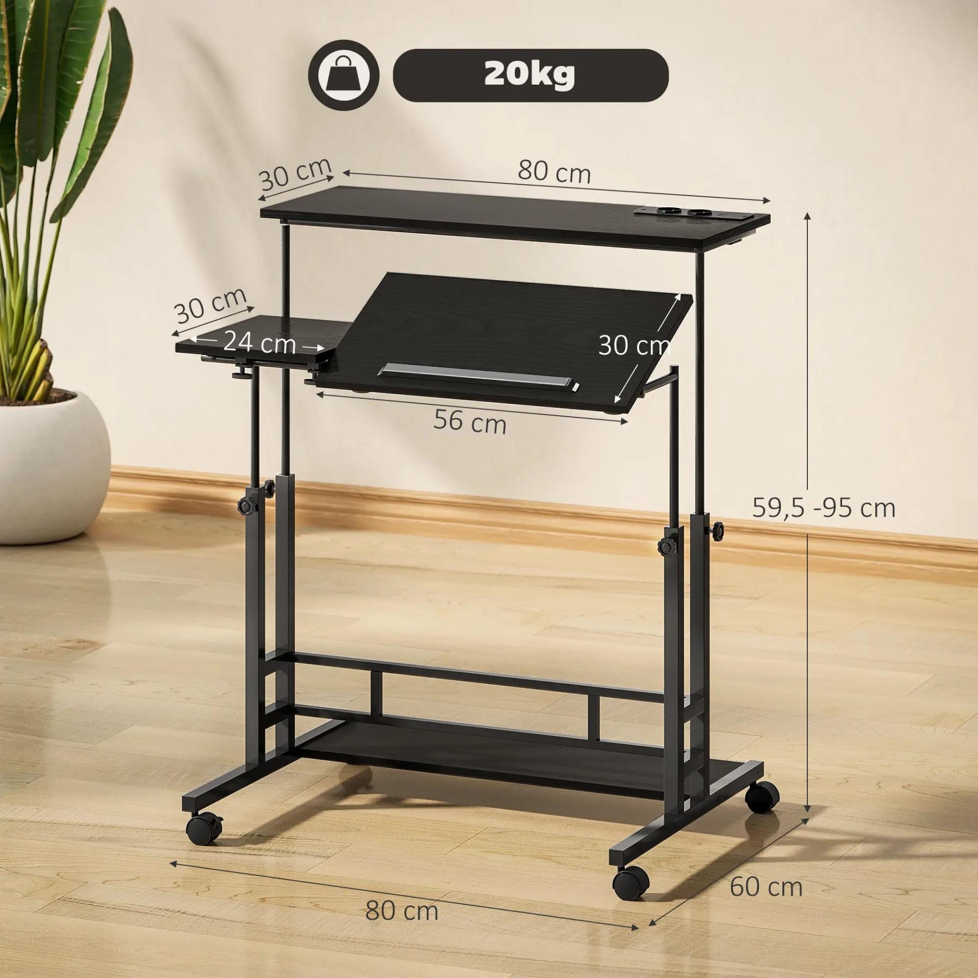 Escritorio Elevable con Ruedas Enchufes Puertos USB Altura Ajustable Panel Central Inclinado y Estante 80x60 cm Negro