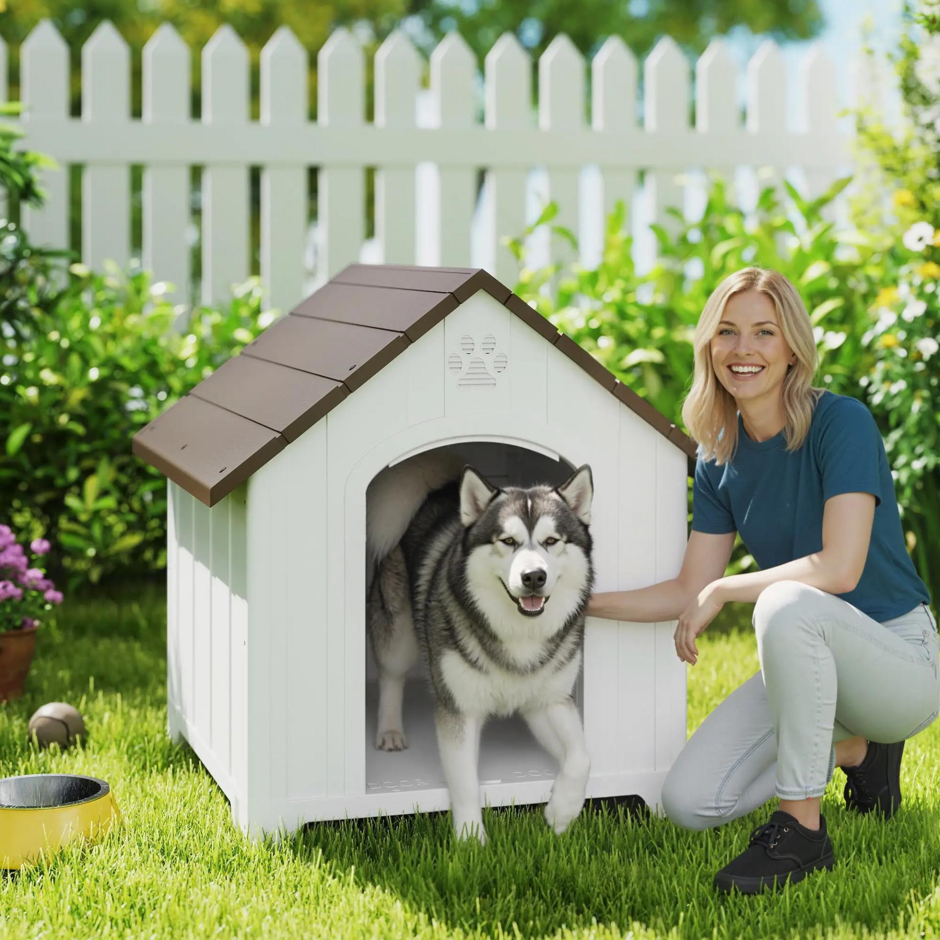 - - FÁCIL DE LIMPIAR: Casa para perros exterior con superficie de PP que se limpia con paño húmedo. Agujeros de drenaje permiten lavado con manguera, facilitando salida de agua sucia para mantenimiento práctico y rápido