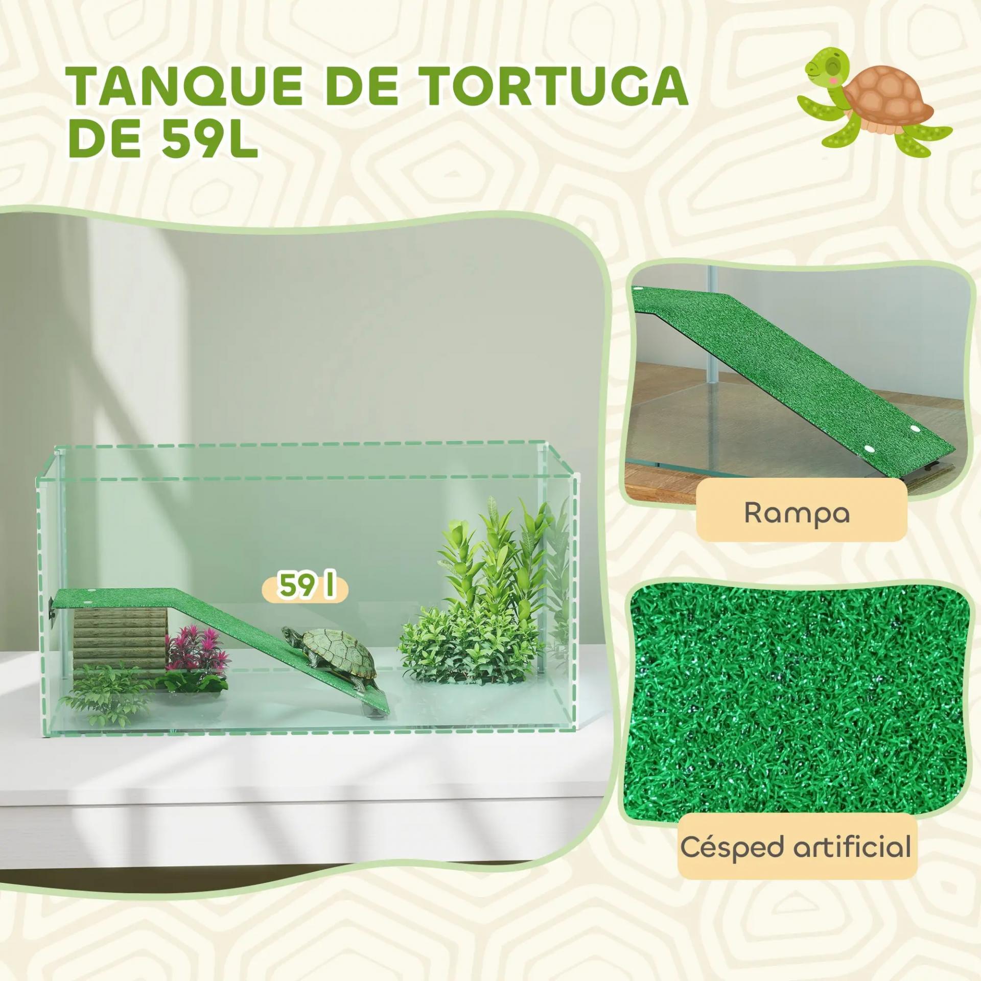 - - PLATAFORMA DE DESCANSO: Este acuario para tortugas incluye una plataforma de acrílico para tomar el sol, diseñada para tortugas con caparazones de hasta 6 cm de longitud. Cuenta con una rampa suave y una superficie de césped artificial para facilitar un ascenso seguro