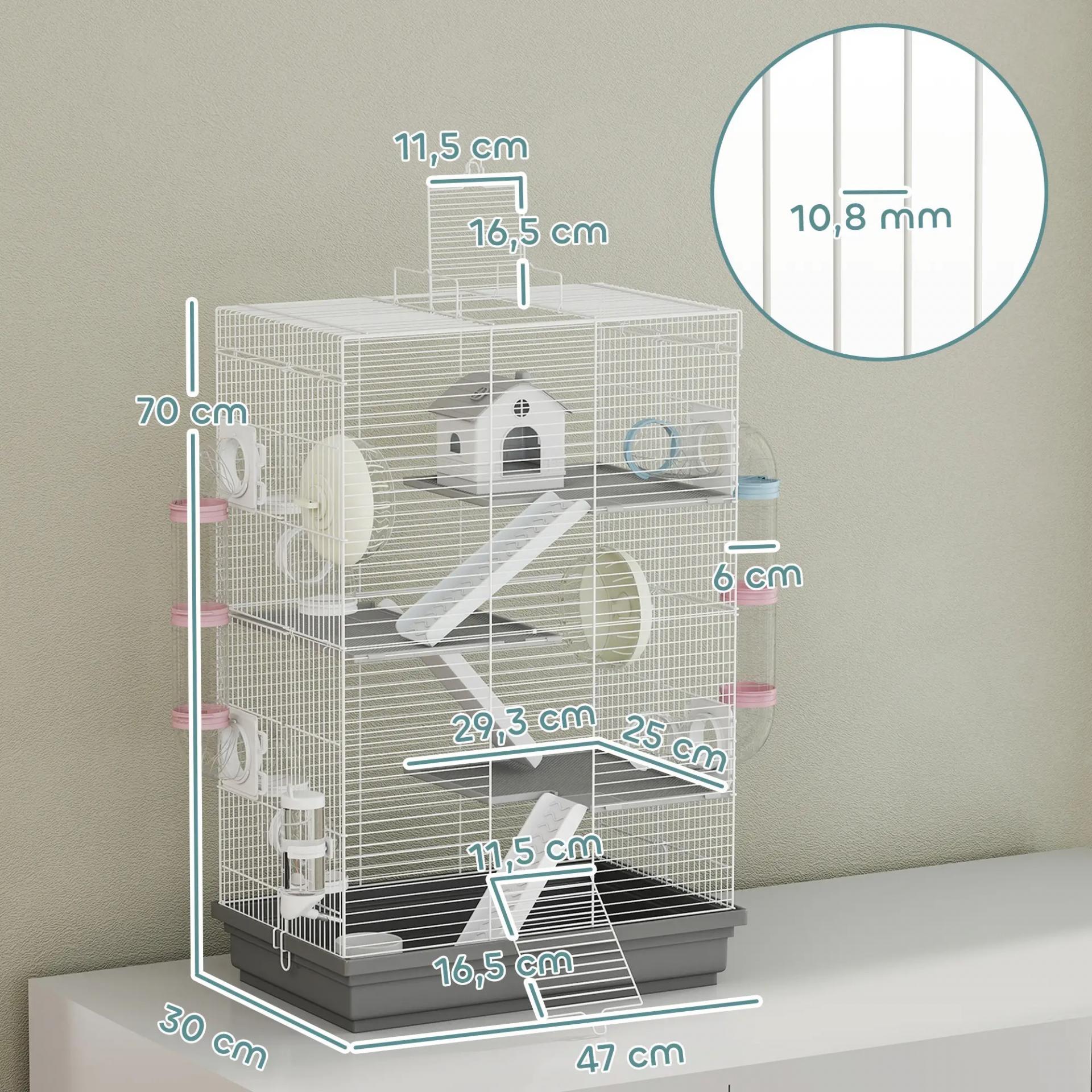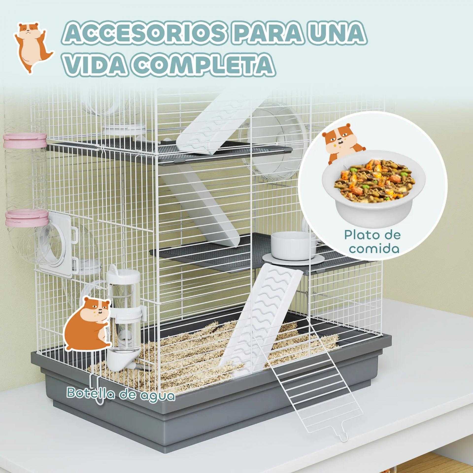 Jaula para Hámster con Túnel Plataformas Cuenco Bebedero Casita Rampas y Rueda de Ejercicio 47x30x70 cm Gris