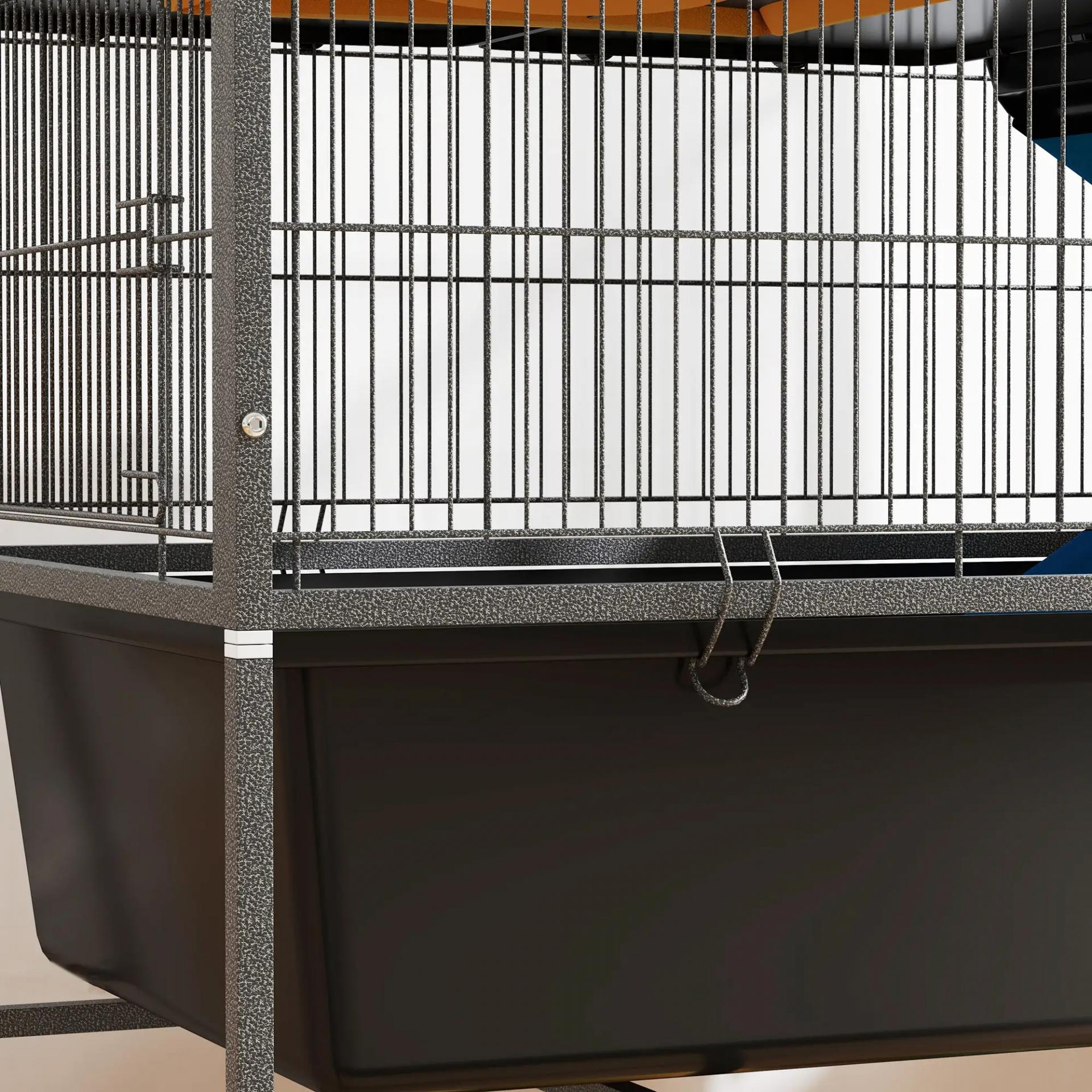 - - CONFORT Y PROTECCIÓN PARA LAS PATAS: Esta jaula para hurones incluye rampas de tela y antideslizante para proteger las patas sensibles, además de una red cómoda para momentos de descanso. La bandeja de 16 cm es fácil de limpiar, garantizando un ambiente higiénico y acogedor
