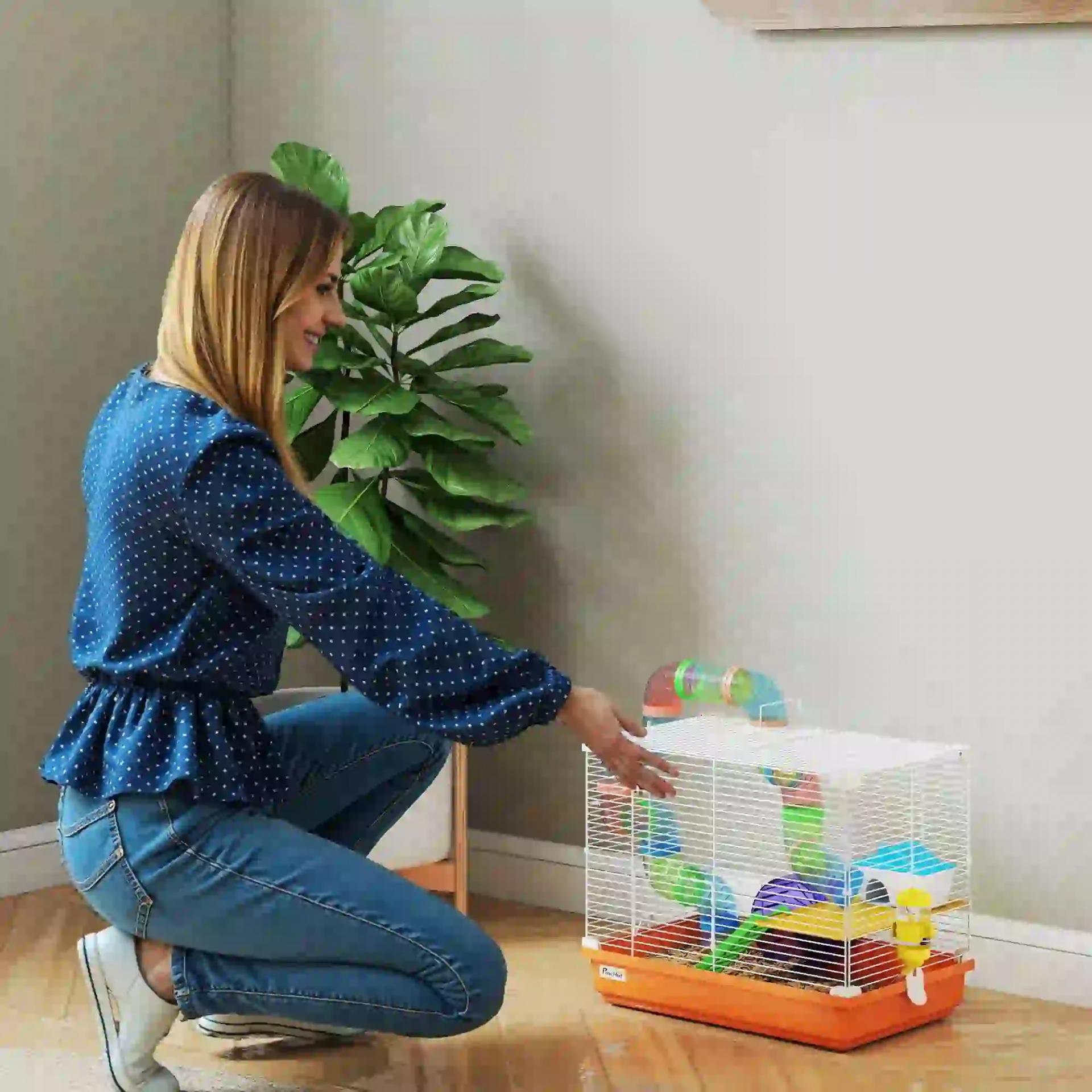 Jaula para Hámster con Túnel Cuenco Bebedero Casita Rampa Rueda de Ejercicio Bandeja Extraíble 46x30x37 cm Naranja