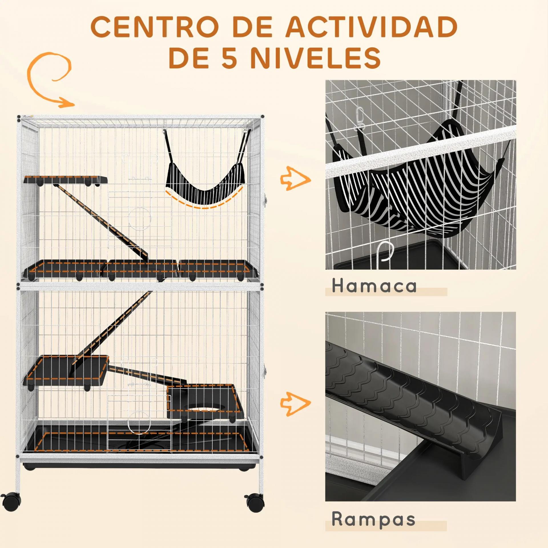 - - MÁXIMO ENTRETENIMIENTO: La jaula para roedores viene con varias plataformas de entretenimiento en 4 alturas, con rampas para subir y bajar fácilmente. Además, también incluye una hamaca colgante en la parte superior de la jaula