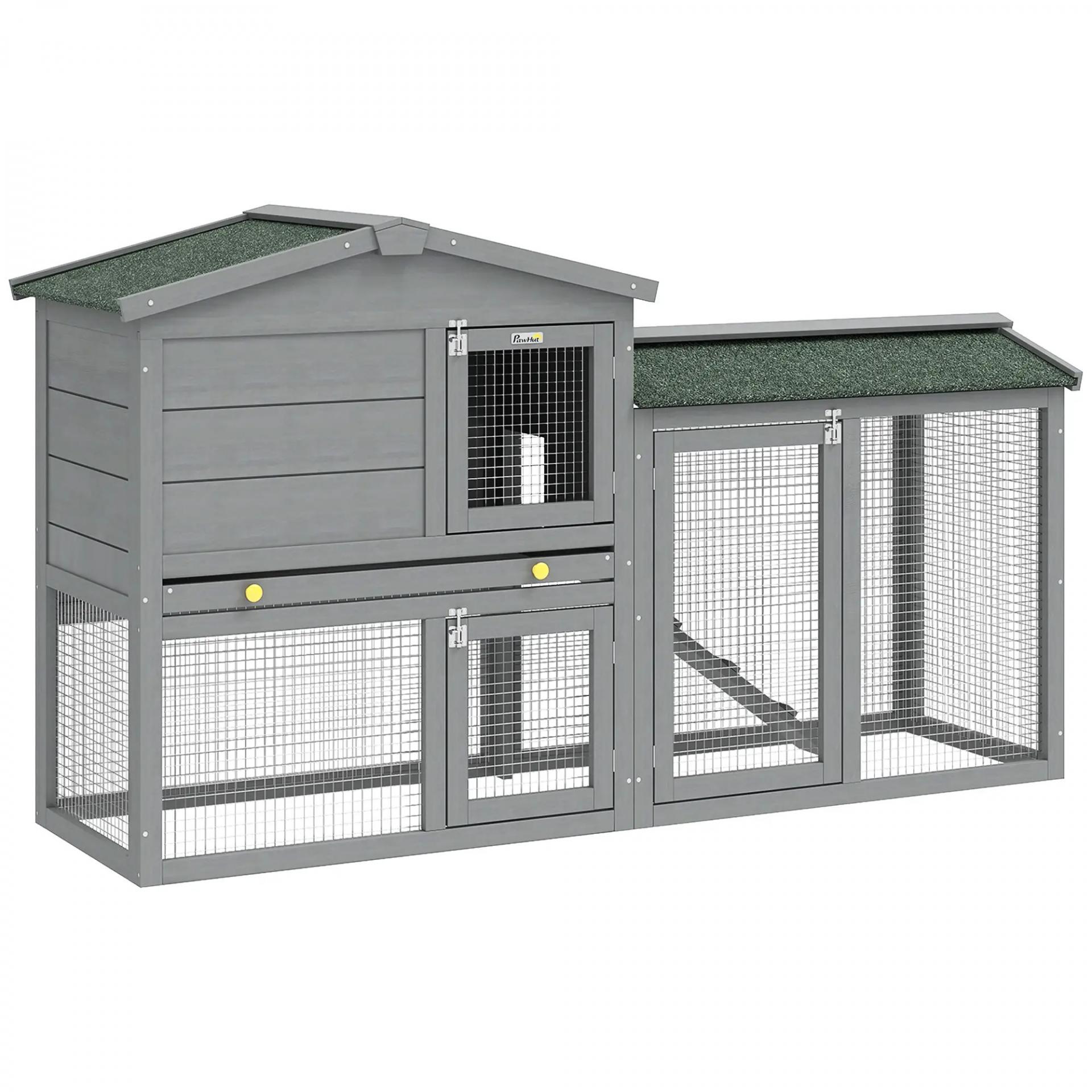 Conejera de Madera de 2 Niveles con Techo Asfáltico Bandeja Extraíble y Escalera para Exterior 150x45x85 cm Gris