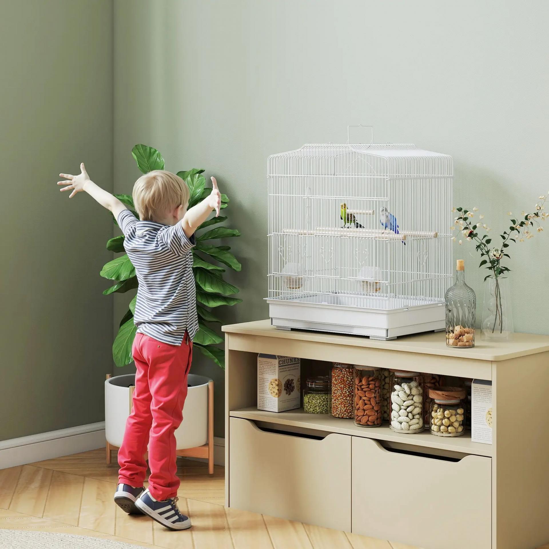 Jaula para Pájaros Pajarera de Acero con 2 Comederos 2 Perchas Columpio y Bandeja Extraíble Asa 46,5x36x59 cm Blanco