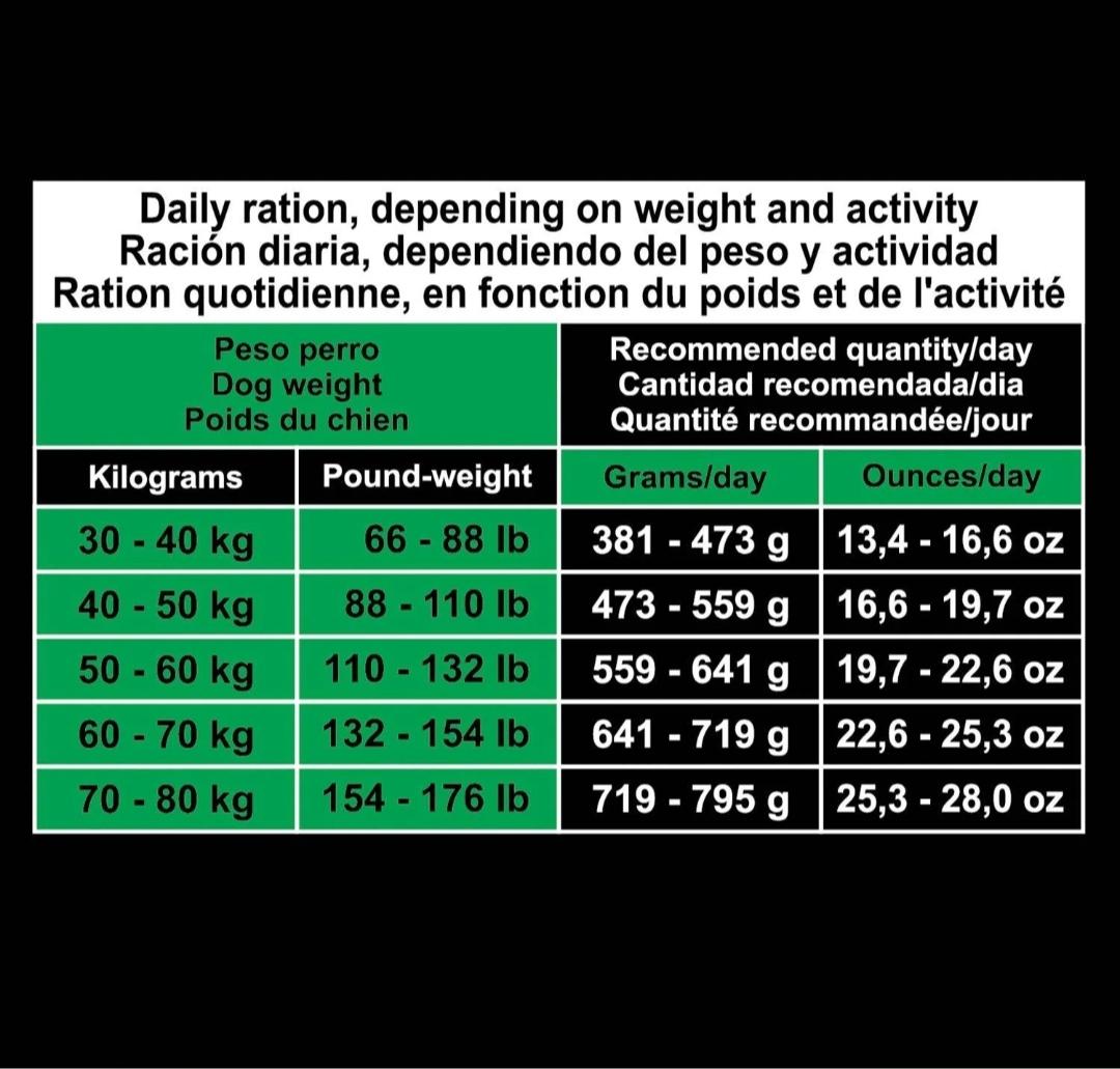 MODO DE EMPLEO: Suministre la ración diaria, preferiblemente dividida en 2 ó 3 tomas al día, y siempre a las mismas horas. La cantidad de alimento puede variar en función de la actividad, raza del perro y condiciones medioambientales.