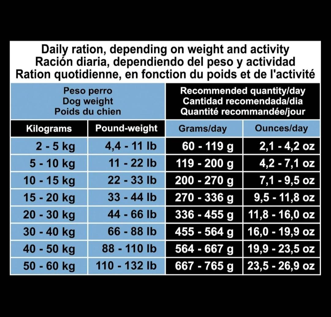 MODO DE EMPLEO: Suministre la ración diaria, preferiblemente dividida en 2 ó 3 tomas al día, y siempre a las mismas horas. La cantidad de alimento puede variar en función de la actividad, raza del perro y condiciones medioambientales.