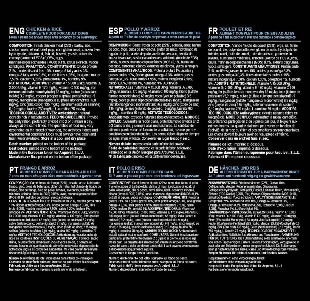 COMPOSICIÓN: Carne fresca de pollo (22%), cebada, arroz, harina de pollo, trigo, pulpa de remolacha, gluten de maíz, hidrolizado de hígado de pollo, aceite de pollo, aceite de pescado, semilla de linaza, levaduras, sustancias minerales, achicoria (fuente de FOS) 0,05%, huevos, manano-oligosacáridos (MOS) 0,1%, harina de pescado, carbonato cálcico, extractos de cítricos, yucca schidigera.