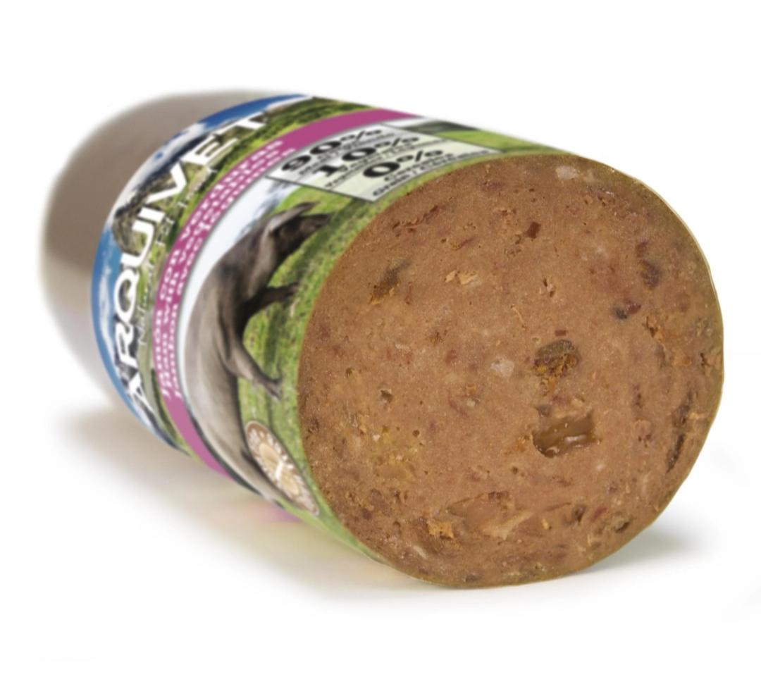 Composición: 90% Carne y derivados (30% jamón), verduras, pulpa remolacha y patatas.