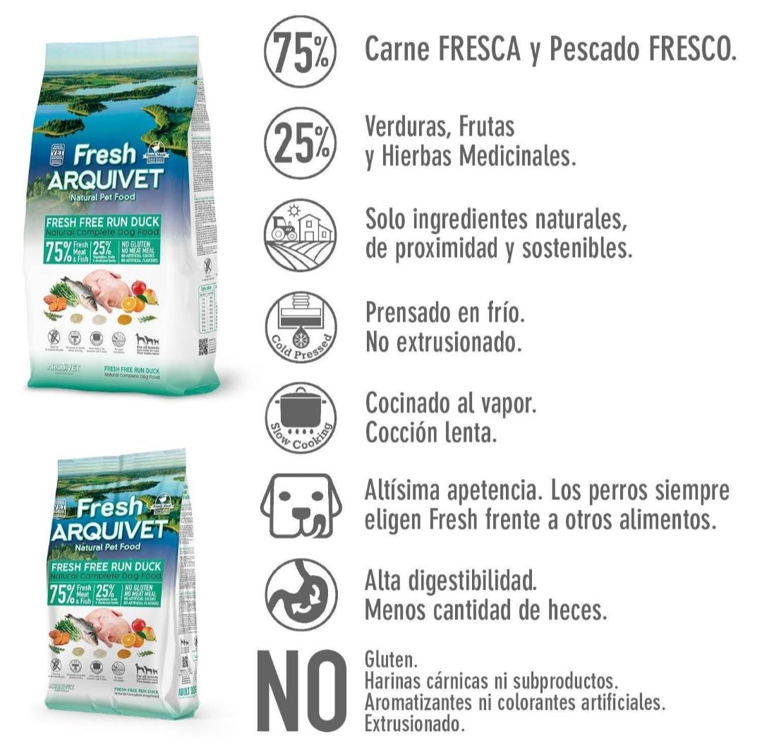 COMPOSICIÓN: 55% pato fresco, 20% pescado fresco (lubina, dorada, atún, pez espada, sardina, boquerón y jurel), almidón parcialmente hidrolizado, pulpa remolacha molida, boniato, levadura cerveza, achicoria, naranja, pera, manzana, curcuma, romero, tomillo.