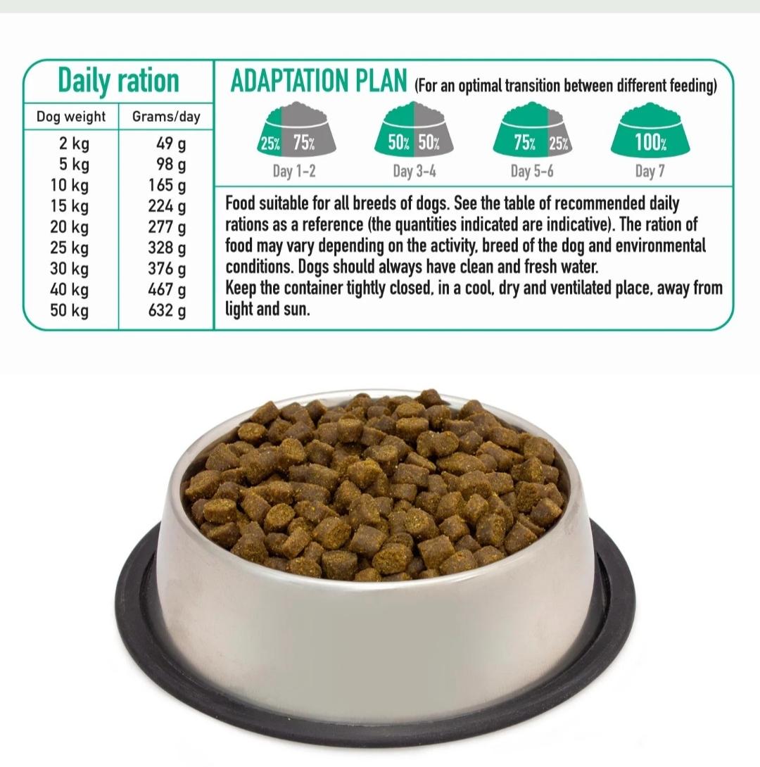 MODO DE EMPLEO: Alimento apto para todas las razas de perros. Tome como referencia la tabla de cantidades diarias recomendadas (las cantidades indicadas son orientativas). La cantidad de alimento puede variar en función de la actividad, raza del perro y condiciones medioambientales. Los perros deben disponer siempre de agua limpia y fresca. Mantener el envase bien cerrado, en un lugar fresco, seco y ventilado, lejos de la luz y el sol.