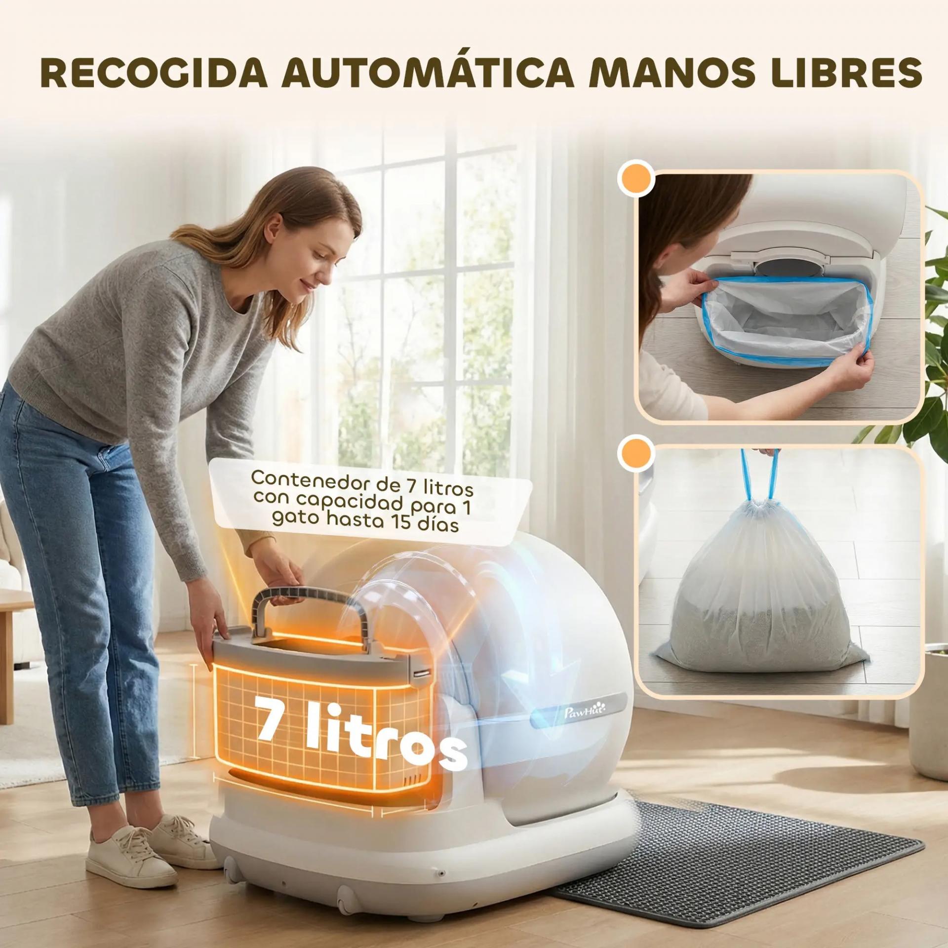 - - DISEÑO ESPACIOSO Y PRÁCTICO: Interior cerrado de 72 L con entrada amplia y baja, adecuado para gatos de 1 a 12 kg. El contenedor de residuos de 7 L reduce la frecuencia de vaciado, facilitando el mantenimiento diario del arenero autolimpiable