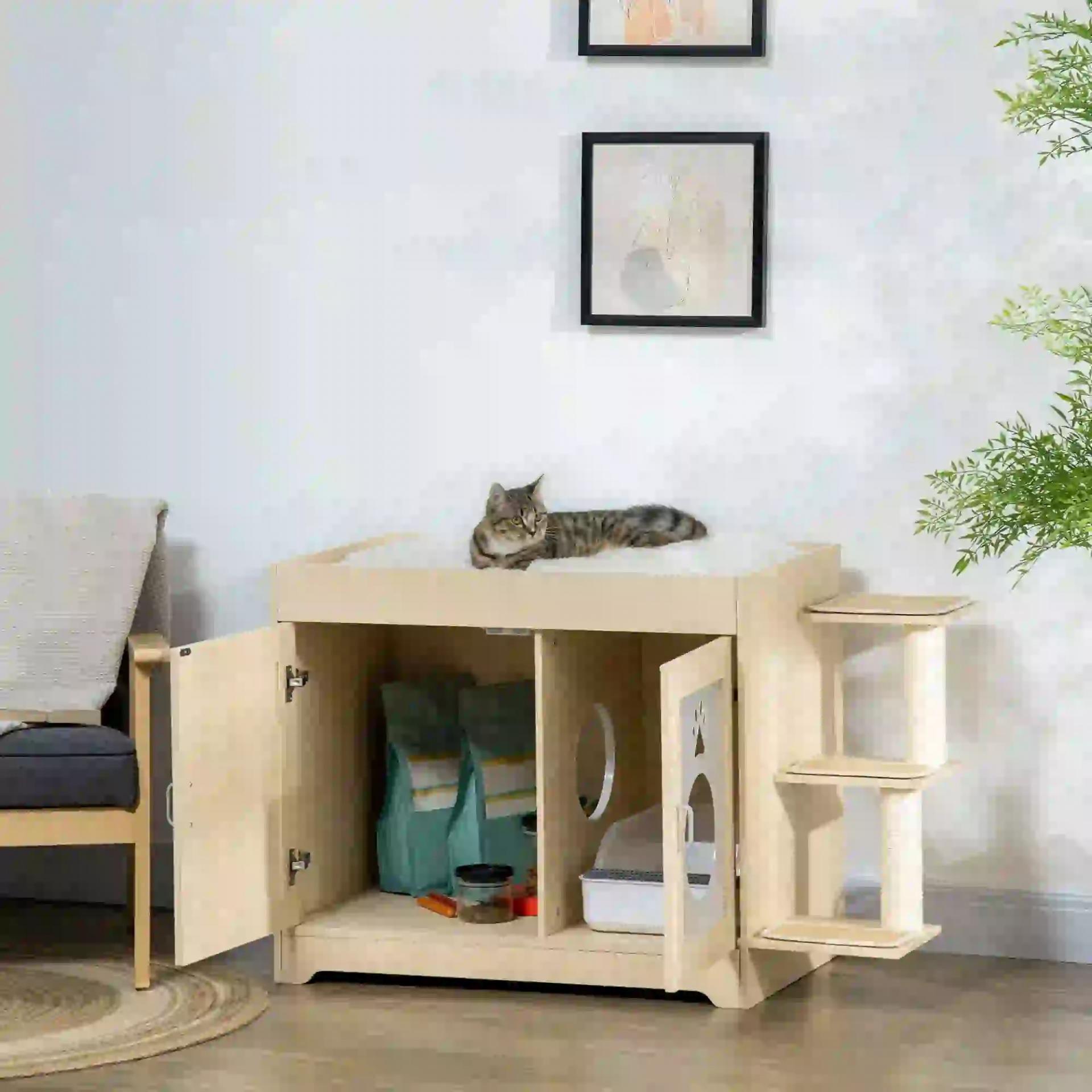 - MULTIFUNCIONAL: Combina una casa para gatos y un mueble para la caja de arena (no incluida). Tus amigos peludos podrán disfrutar de un área cómoda para dormir en la casa superior para gatos, que tiene un suave cojín de felpa. Además, disminuye el olor y mantiene la caja de arena oculta a la vista