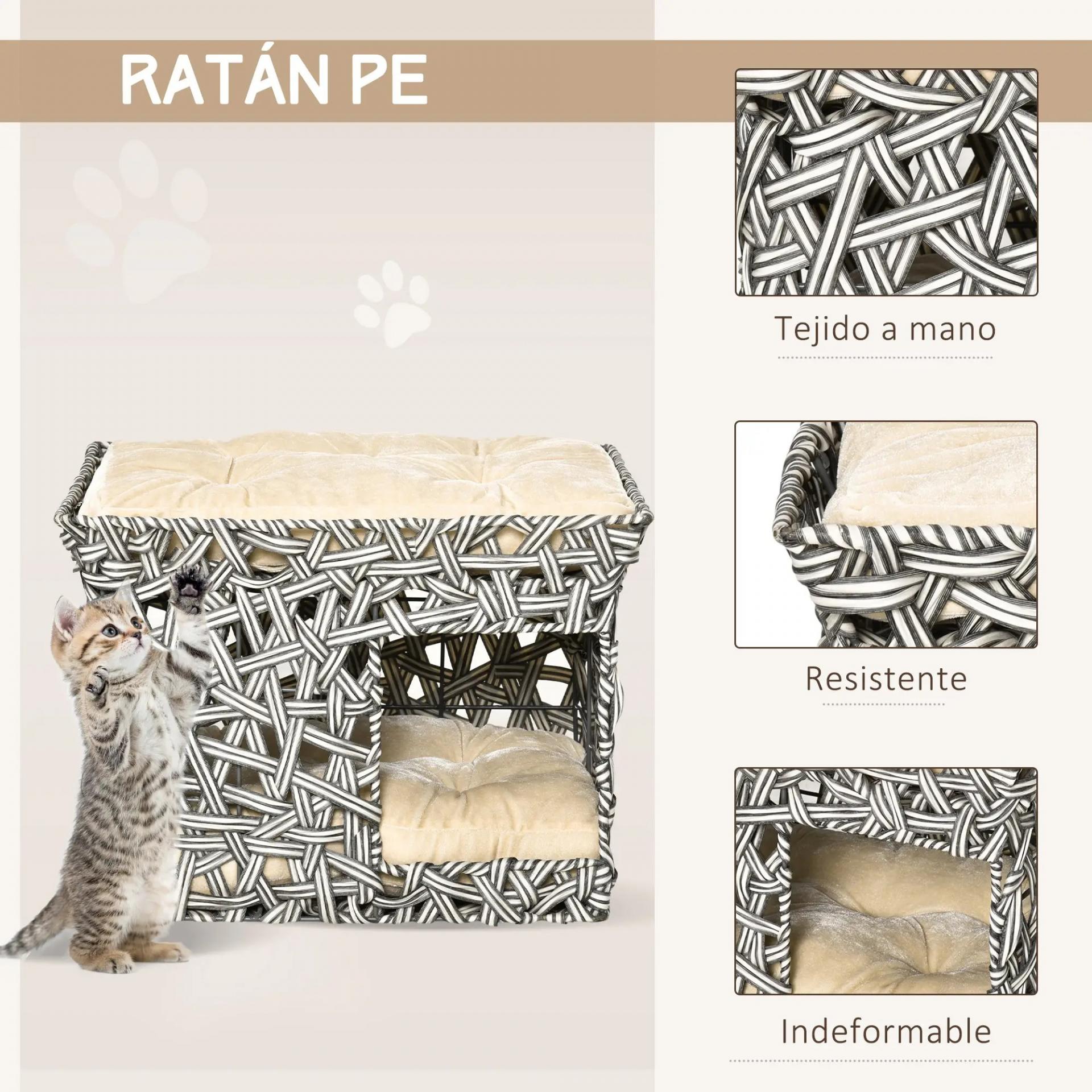 - DOBLE CAMA DE RATÁN PE: Hecha de metal y ratán PE, esta doble cama para gatos ofrece un aspecto realista como si de ratán natural se tratase. No tóxico y resistente, es un espacio cómodo y seguro para tus amigos peludos