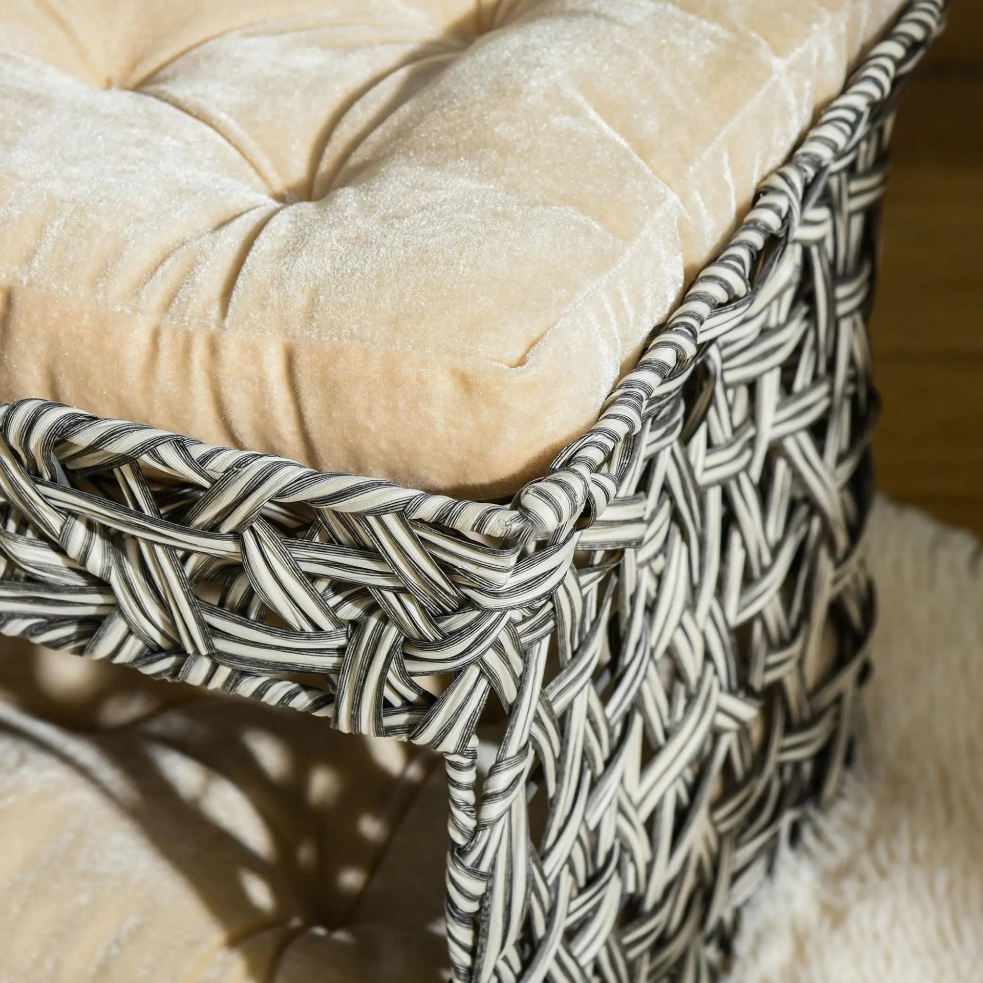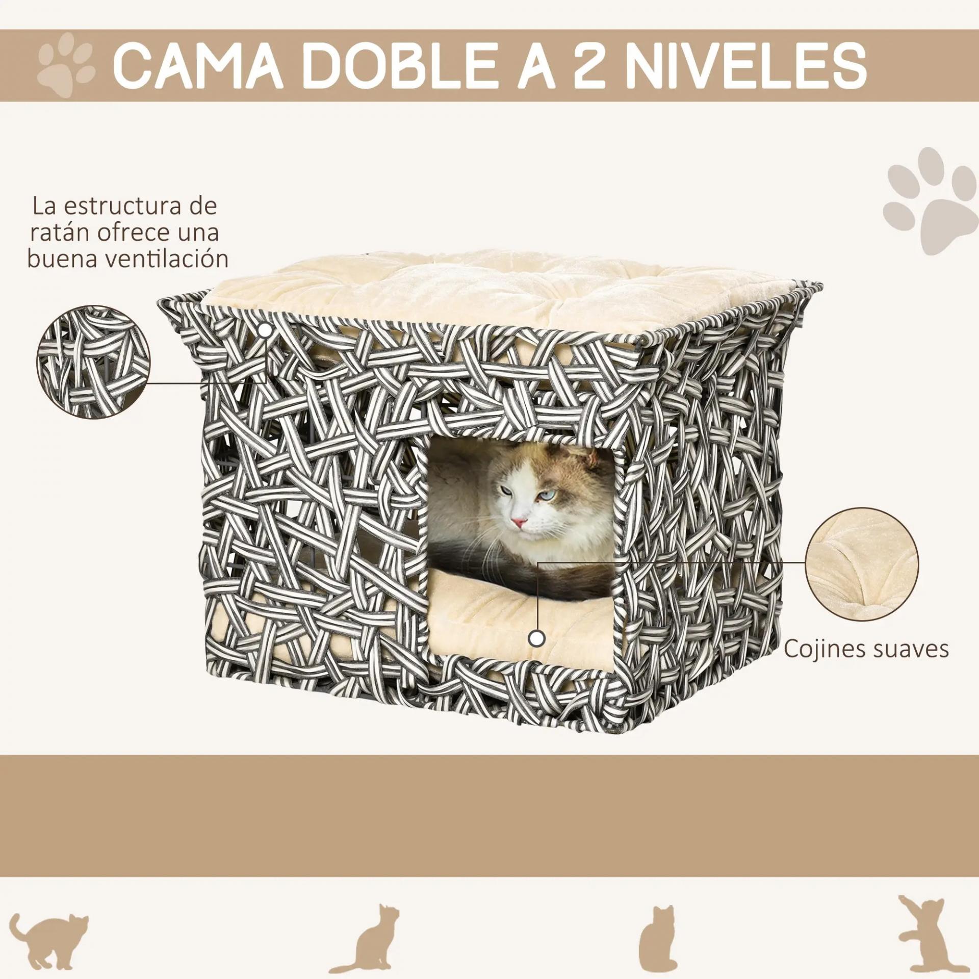 Cesta de Ratán para Gatos de 2 Pisos Cueva Cama de Gato Tipo Caseta con 2 Cojines Suaves Estructura de Metal 51x42x37 cm Gris y Beige
