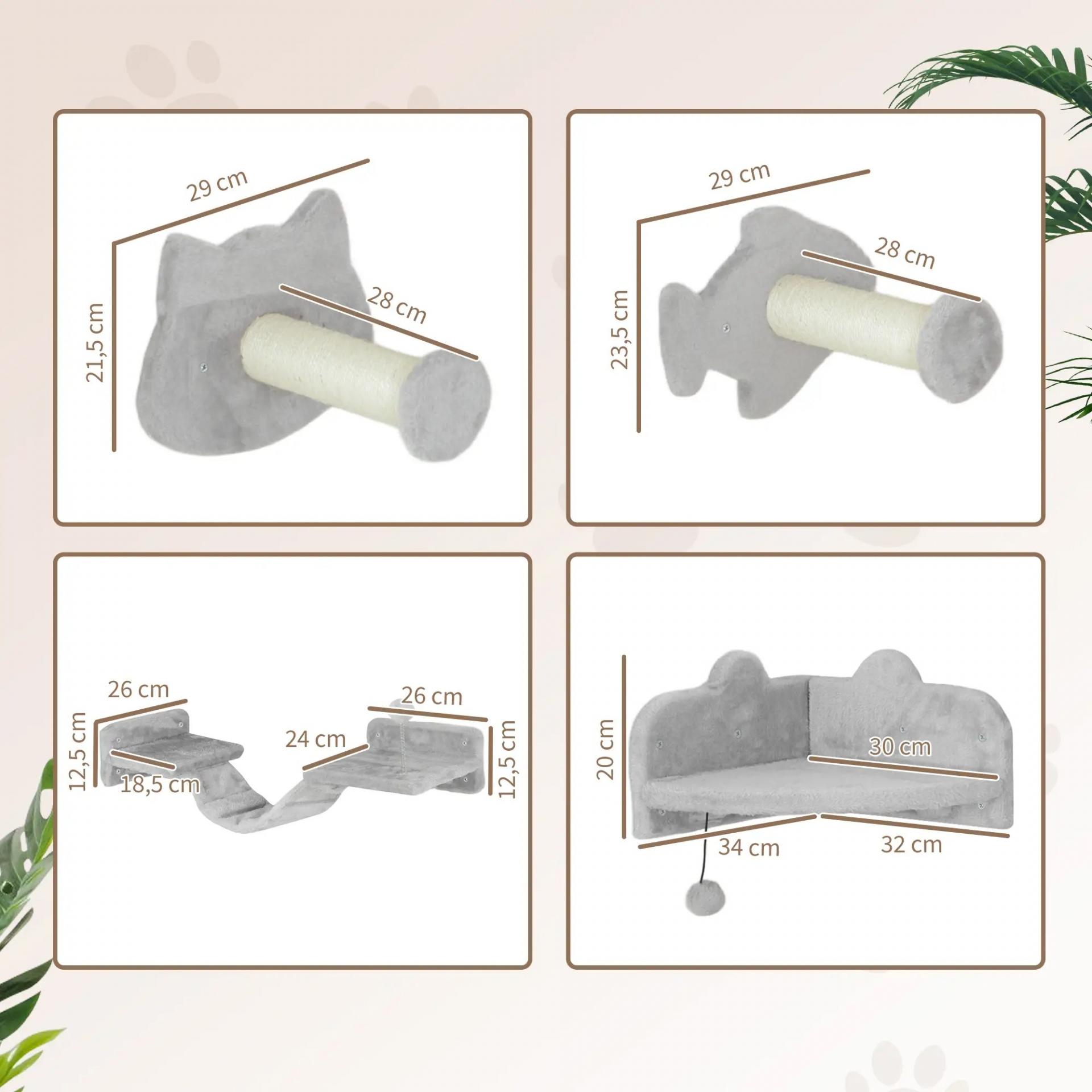 Rascador de Pared para Gatos con 2 Postes de Sisal Plataforma Doble con Escalera Suave y 1 Plataforma para Saltar Gris