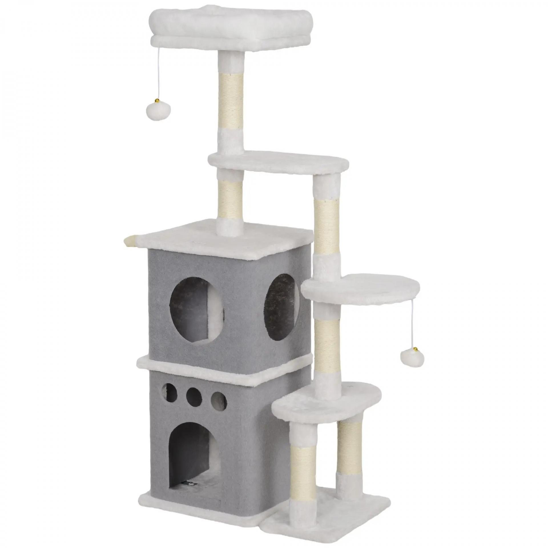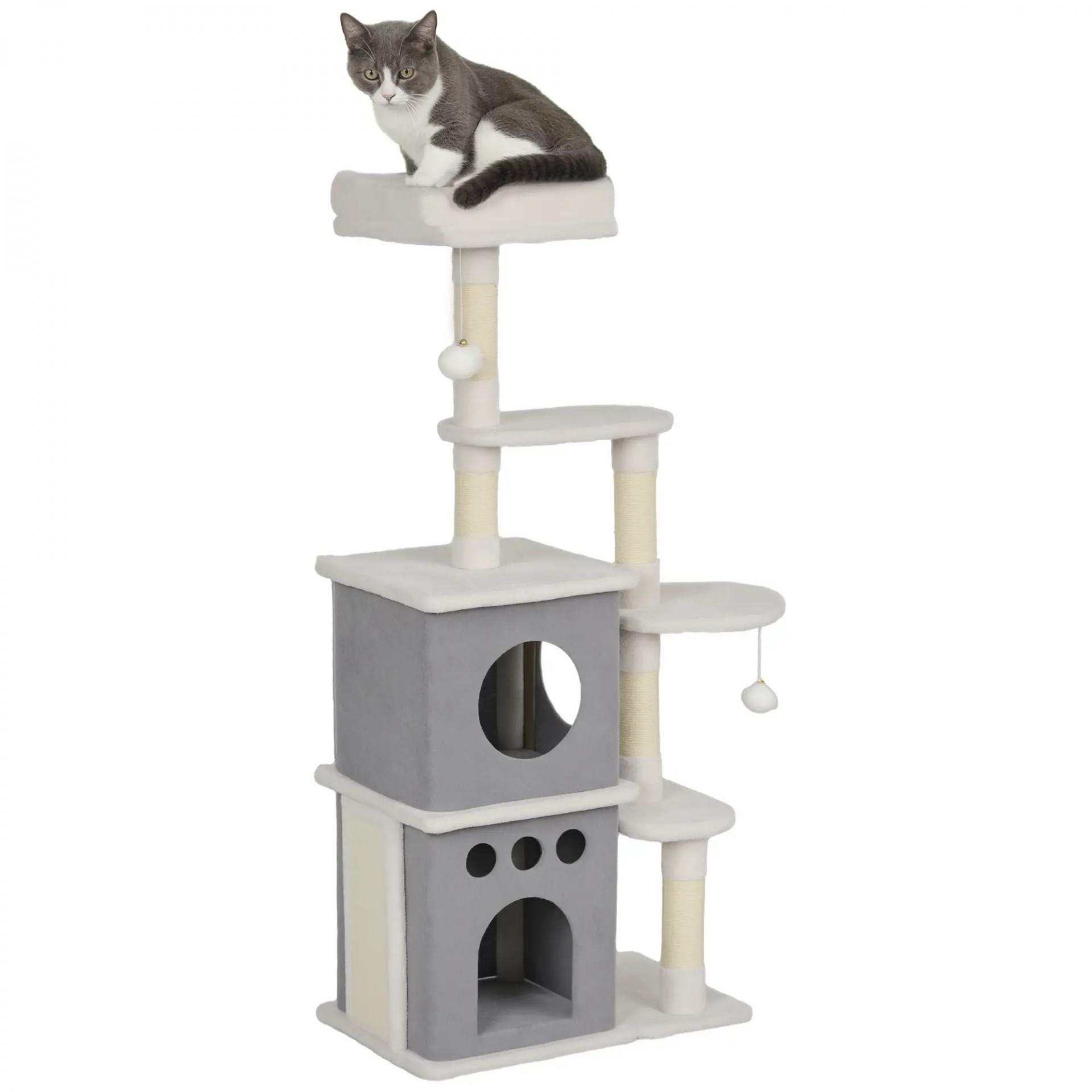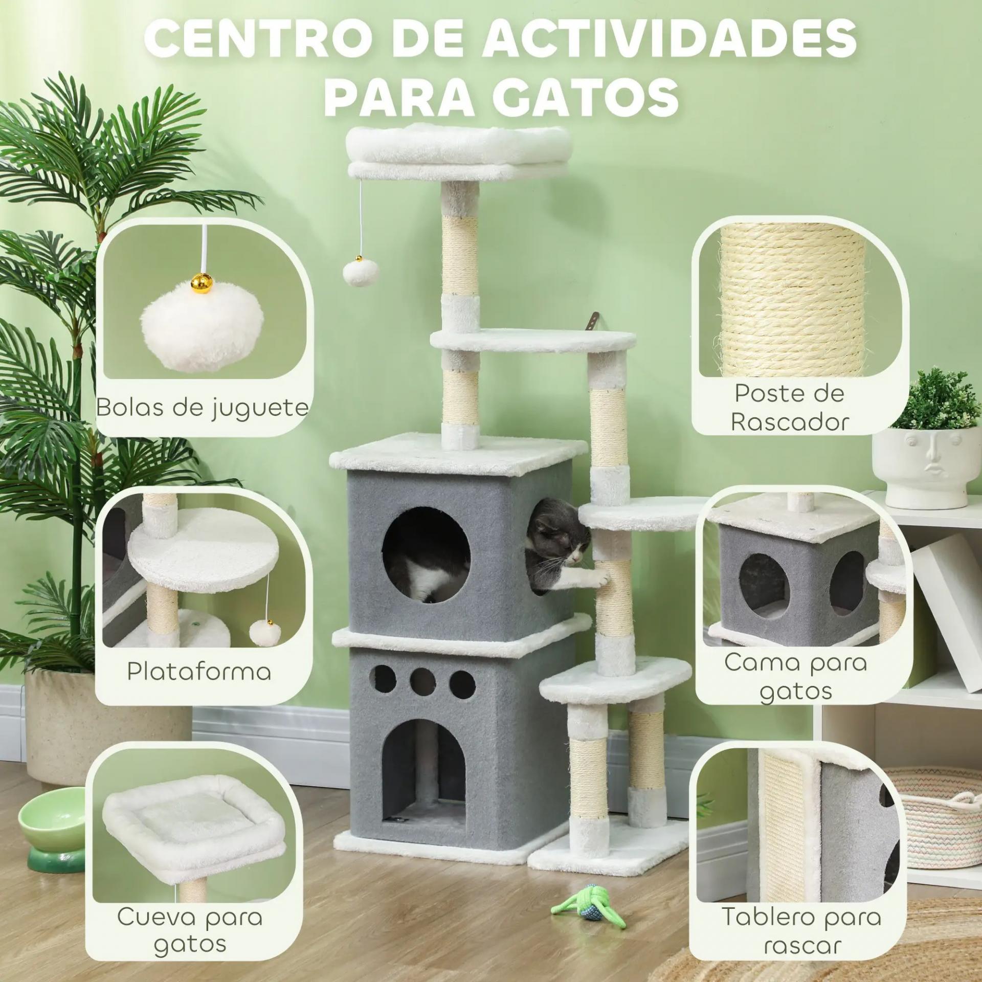 - TODO EN UNO: Tu gato disfrutará de un lugar perfecto para explorar y descansar con este rascador para gatos. Incluye postes para rascar, una cama de felpa, dos cuevas, varias plataformas, un panel para rascar y bolas para jugar, ofreciendo entretenimiento y descanso sin fin