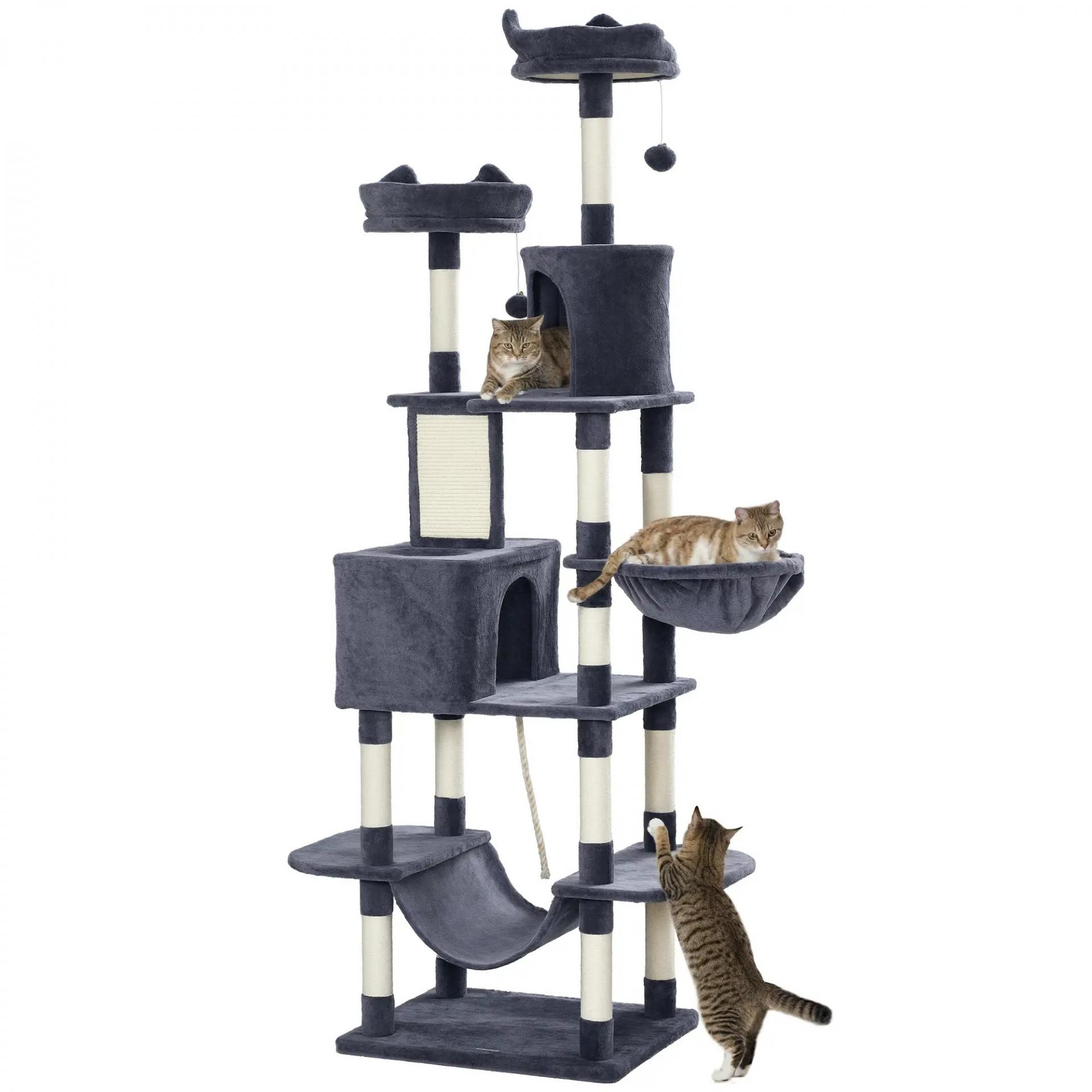 - ESPACIOSO Y VERSÁTIL: Este árbol rascador para gatos incluye dos camas acolchadas, dos cuevas espaciosas, varias plataformas de salto y dos hamacas, proporcionando múltiples opciones para que tus gatos se relajen y jueguen