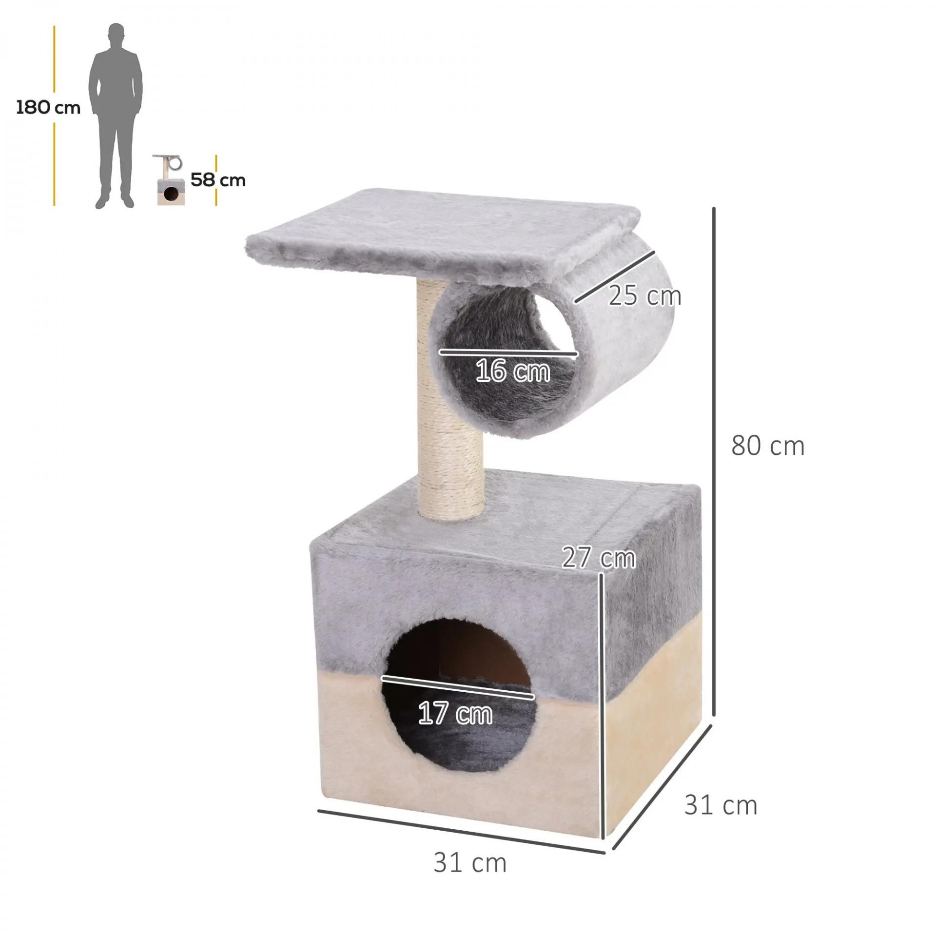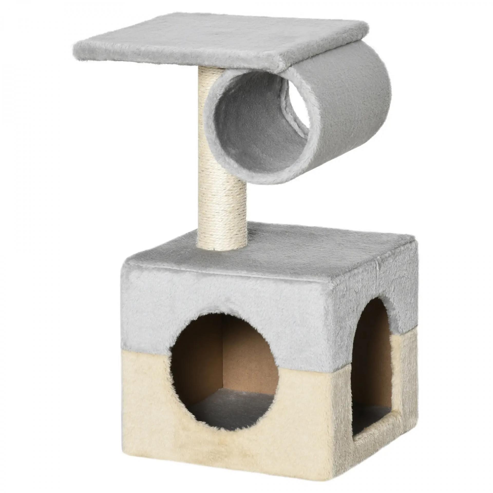 Rascador Árbol para Gatos 31x31x58 cm con Poste Central Casa Cama de Felpa Suave para Arañar Dormir y Jugar Gris y Beige