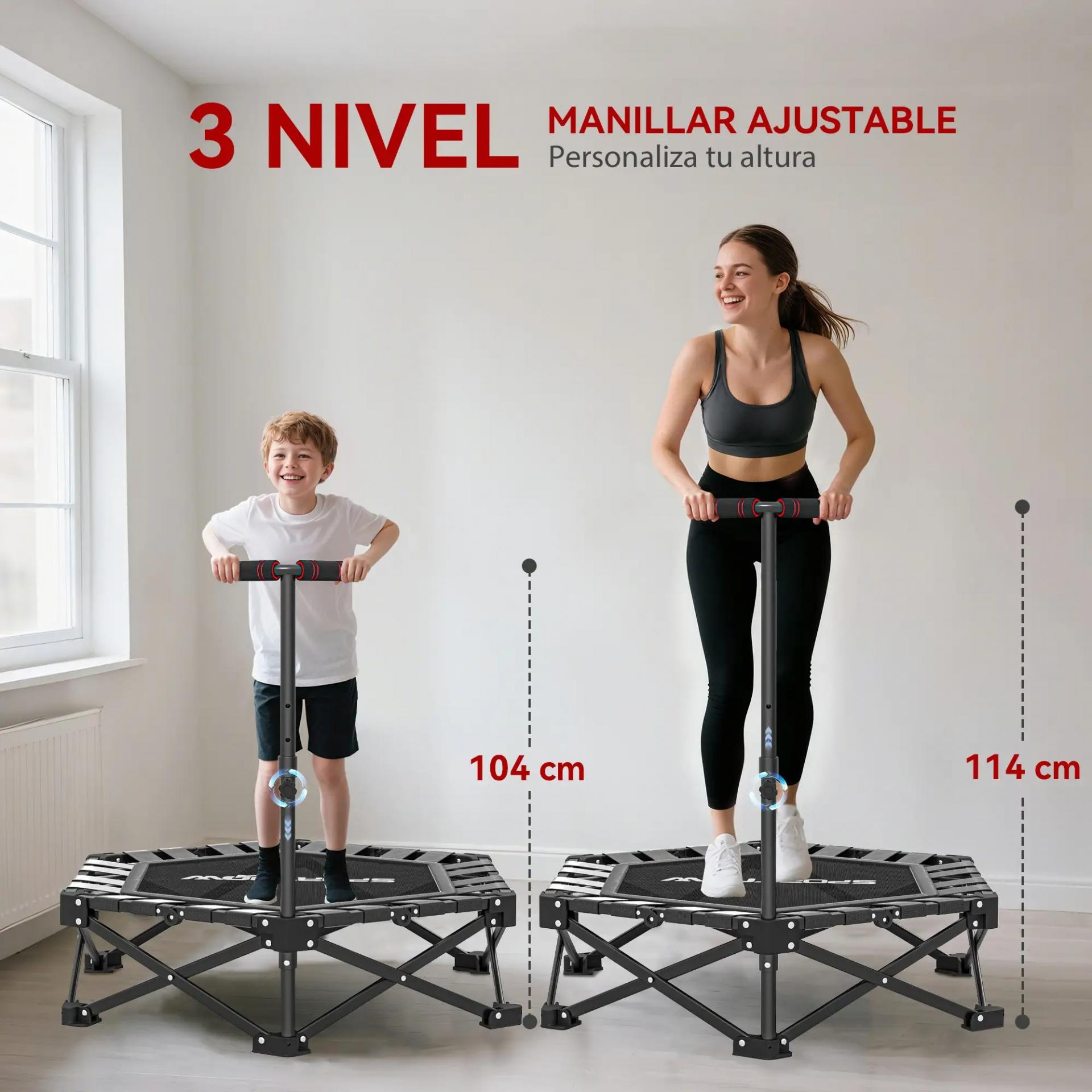 - - BARRA T AJUSTABLE EN ALTURA: El trampolín fitness adultos incorpora una barra en forma de T regulable a tres alturas (104/109/114 cm), adaptándose a diferentes usuarios y garantizando una rutina de salto segura, cómoda y personalizada