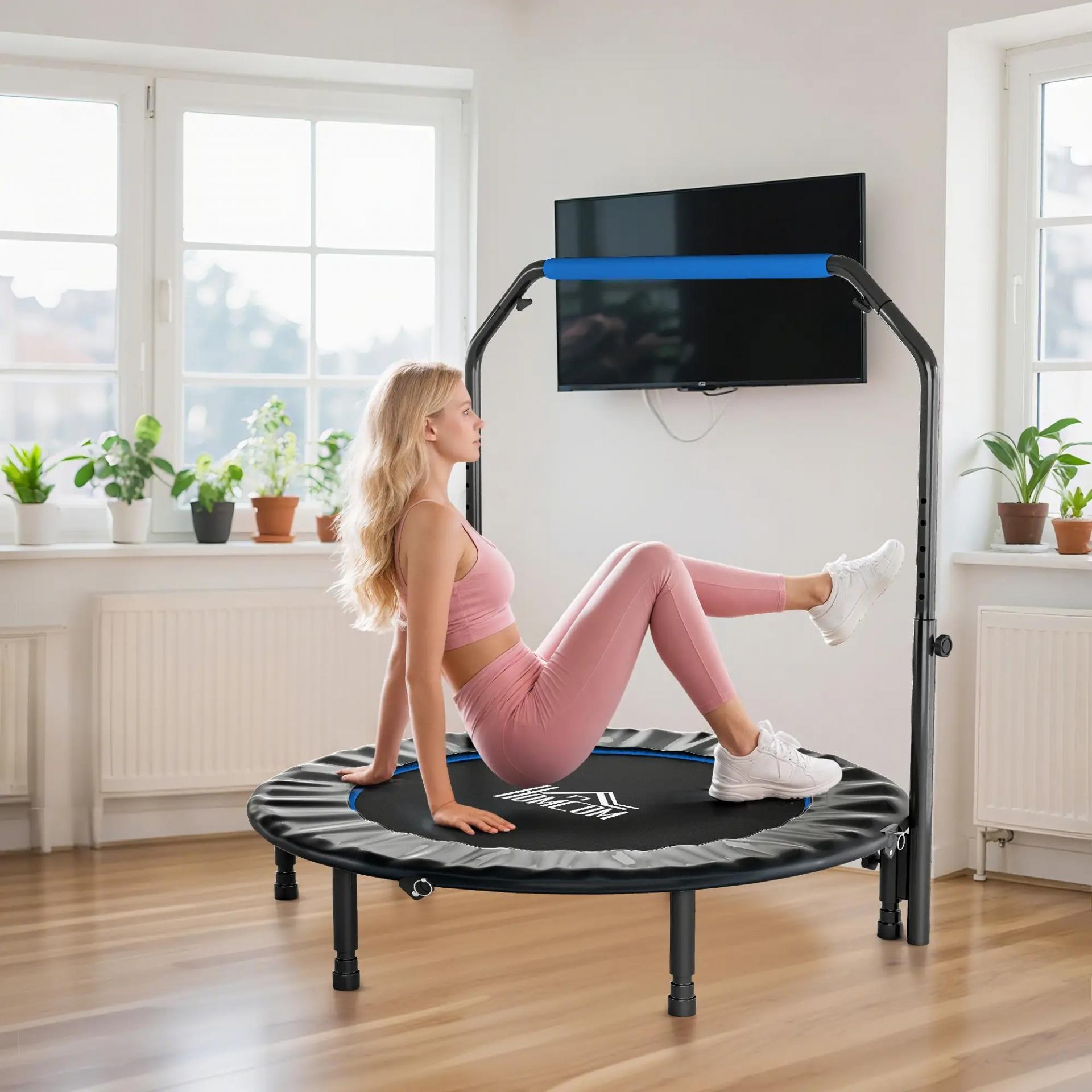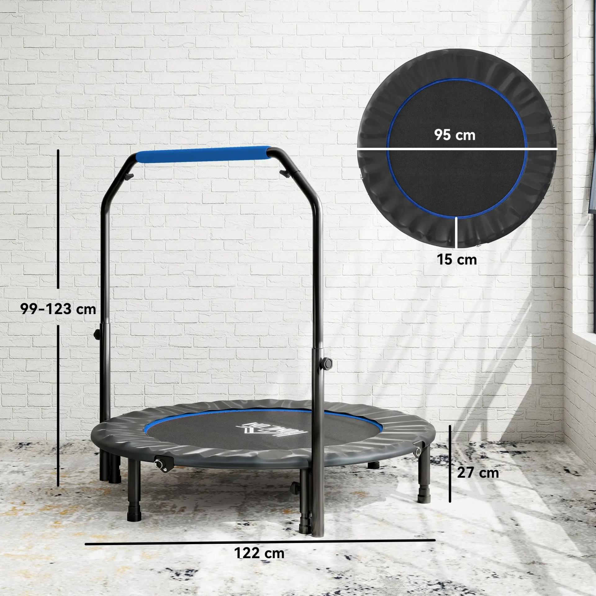 - TRAMPOLÍN DE FITNESS CON MANGO AJUSTABLE: Este trampolín de fitness para adultos cuenta con un mango ajustable en cuatro niveles, desde 99 a 123 cm, adaptándose perfectamente a tus hábitos de uso. Es como si estuviera hecho a medida para ti