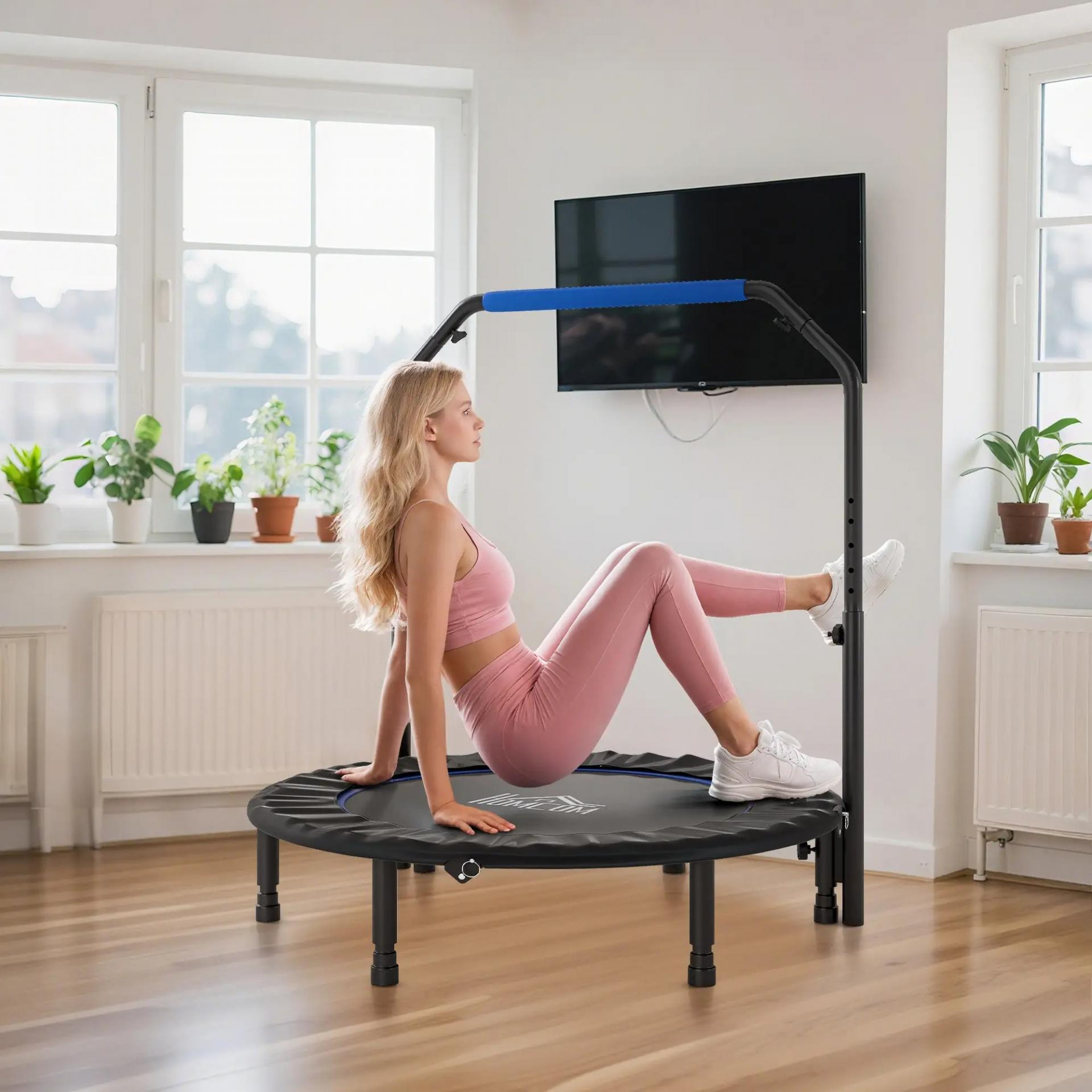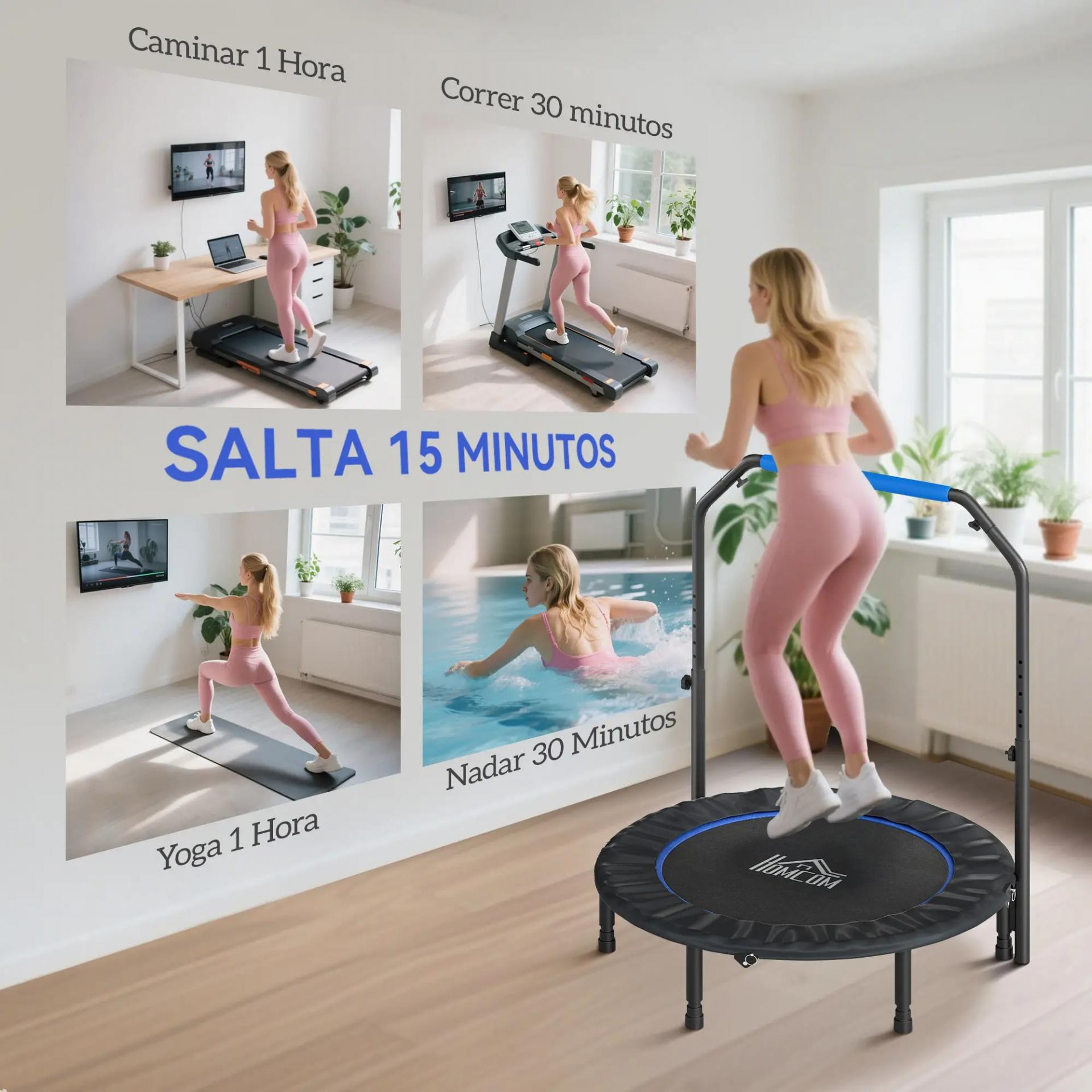 - TRAMPOLÍN DE FITNESS CON MANGO AJUSTABLE: Este trampolín de fitness para adultos cuenta con un mango ajustable en cuatro niveles, desde 99 a 123 cm, adaptándose perfectamente a tus hábitos de uso. Es como si estuviera hecho a medida para ti