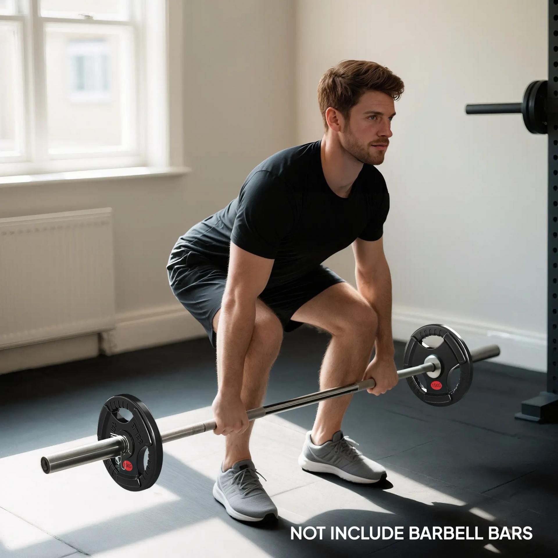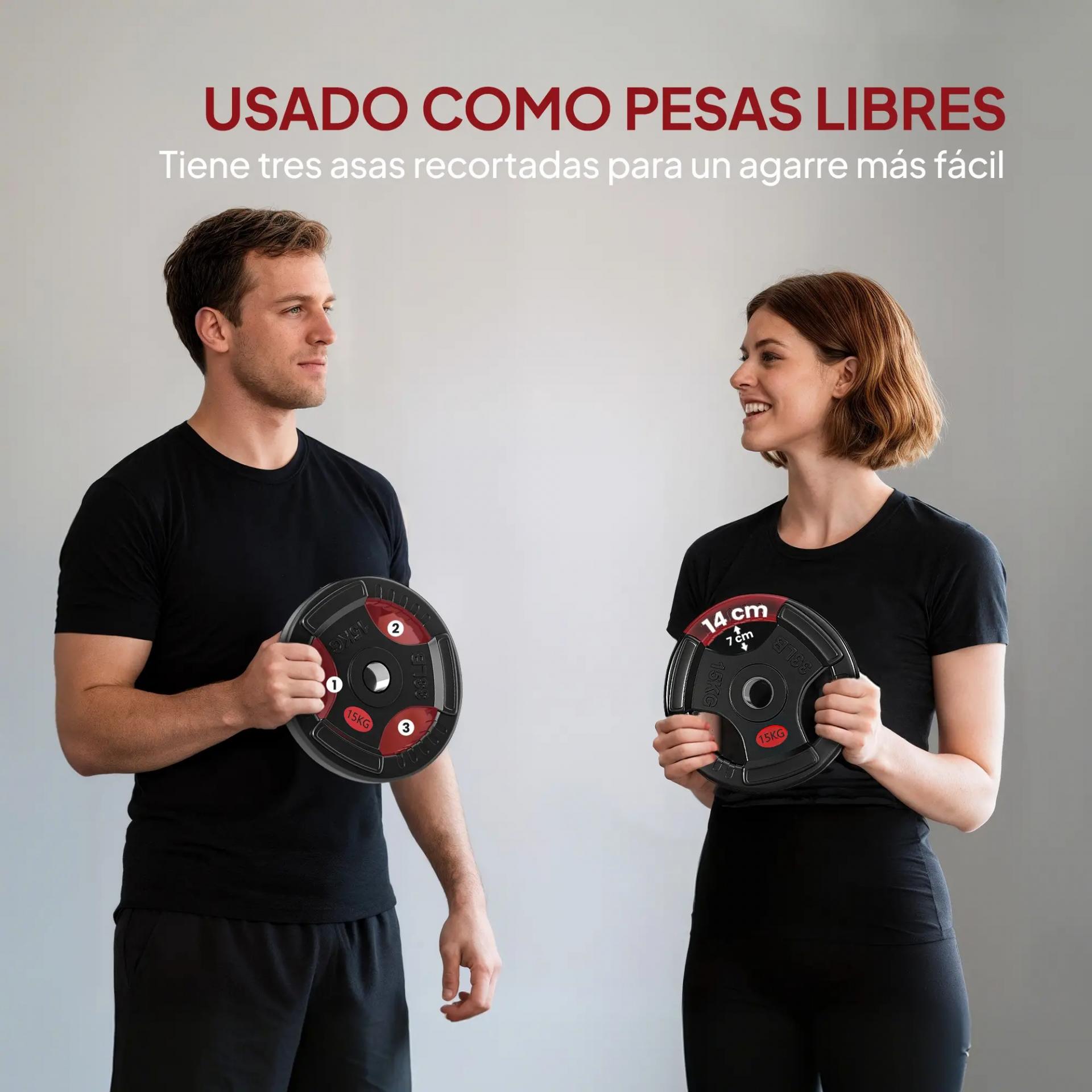 - - TRIPLE AGARRE ERGONÓMICO: Gracias a sus tres orificios laterales, cada disco de pesa se puede utilizar con o sin barra, permitiendo realizar ejercicios variados como sentadillas, giros o zancadas con mayor comodidad y seguridad