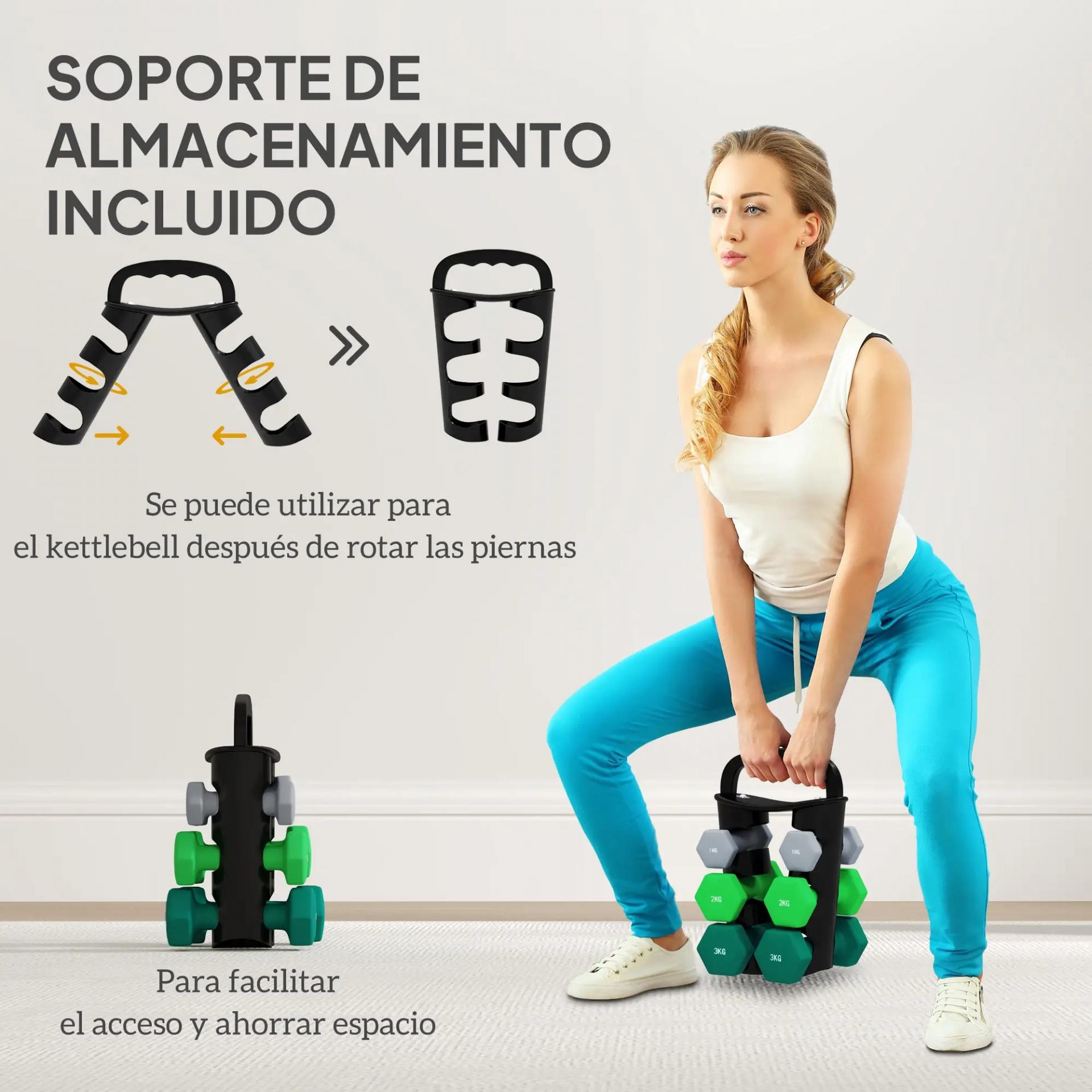 - - SOPORTE ESPECIAL PARA MANCUERNAS: El soporte para mancuernas se transforma en kettlebell al girarlo, lo que permite ajustar el peso fácilmente al añadir o quitar mancuernas según tu rutina