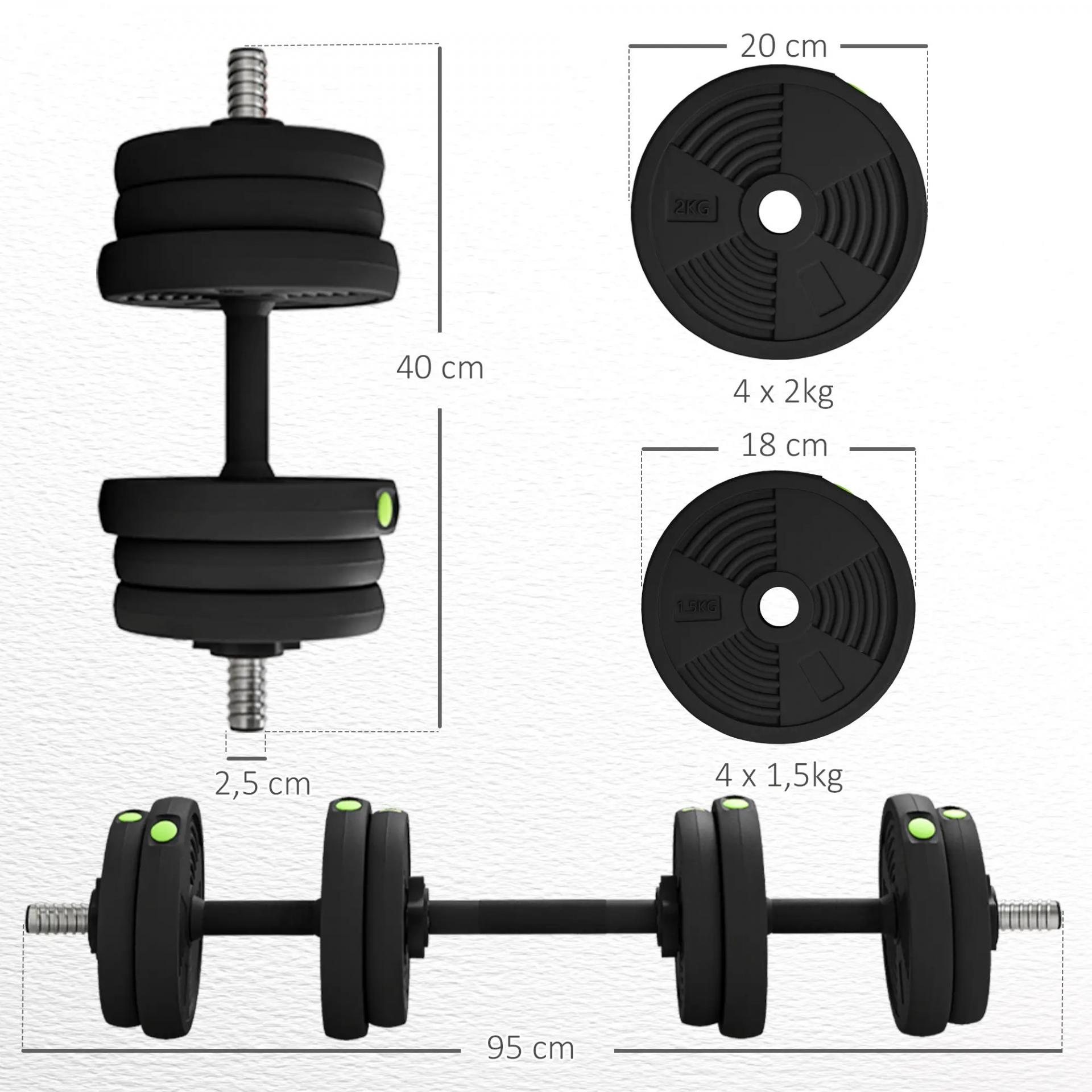- - SET DE 15 KG: El set de mancuernas incluye discos de diferentes pesos (4 de 2 kg y 4 de 1,5 kg) y dos barras de 0,5 kg cada una. Puedes ajustar el peso a tu gusto