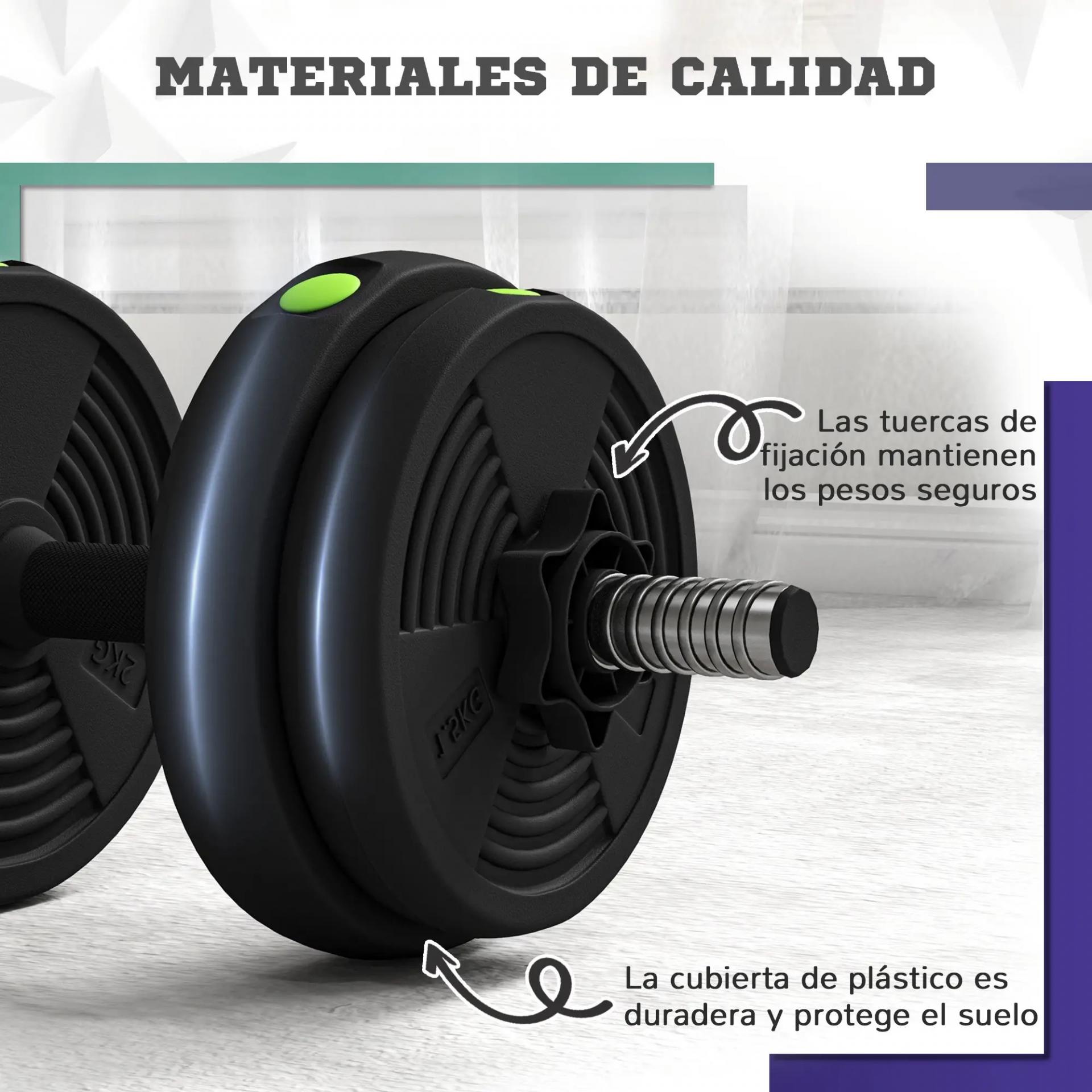 - - MATERIAL DURADERO: Las pesas de este juego de mancuernas para casa están revestidas en plástico resistente que protege tus suelos de rasguños o marcas. Entrena en casa con la tranquilidad de que tu equipo está diseñado para cuidar de ti y de tu espacio