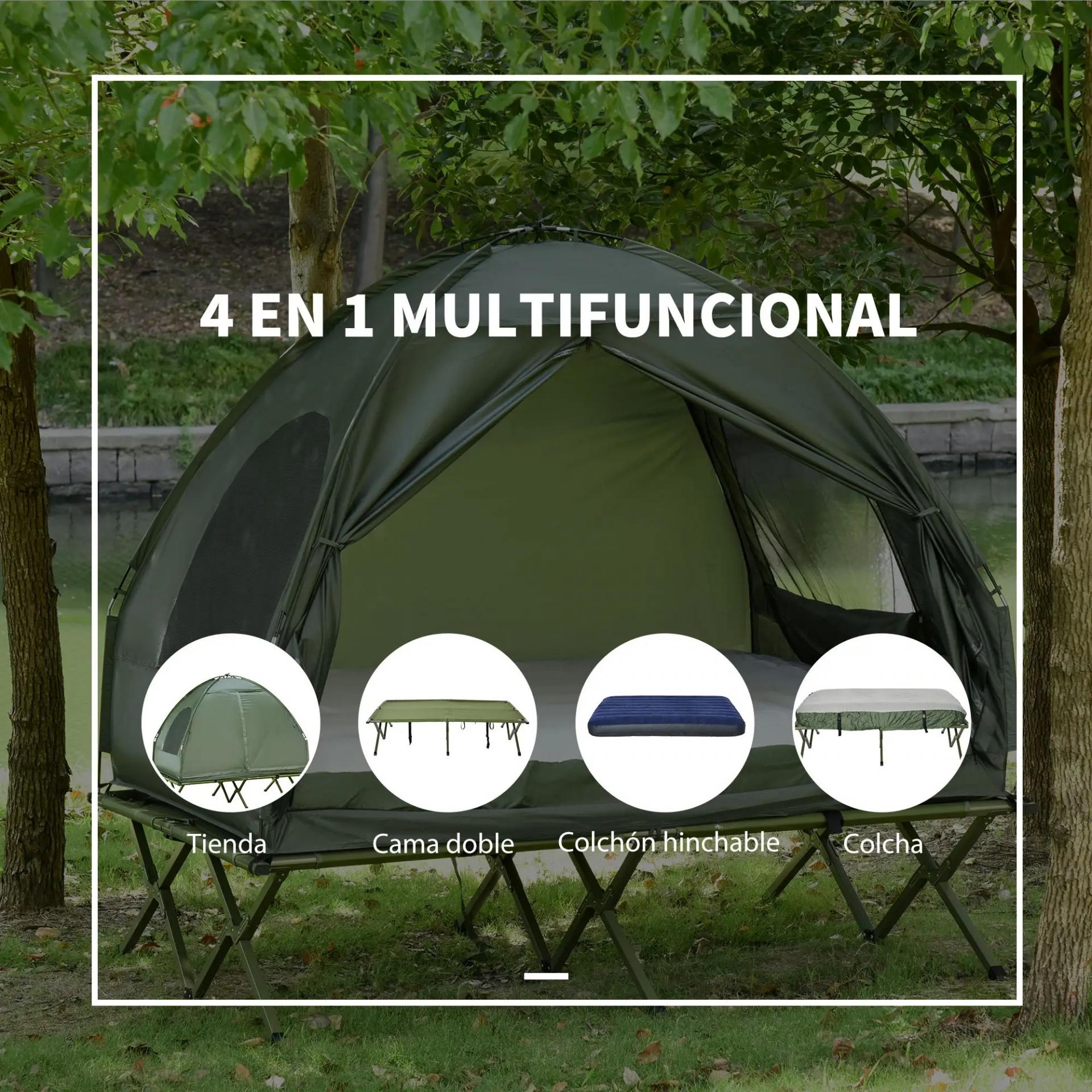 Cama Doble de Camping Plegable con Tienda de Campaña 4 en 1 Cama de Campamento Elevada con Colchón Hinchable y Bolsa de Transporte Tela Oxford Acero 193x145x180 cm Verde