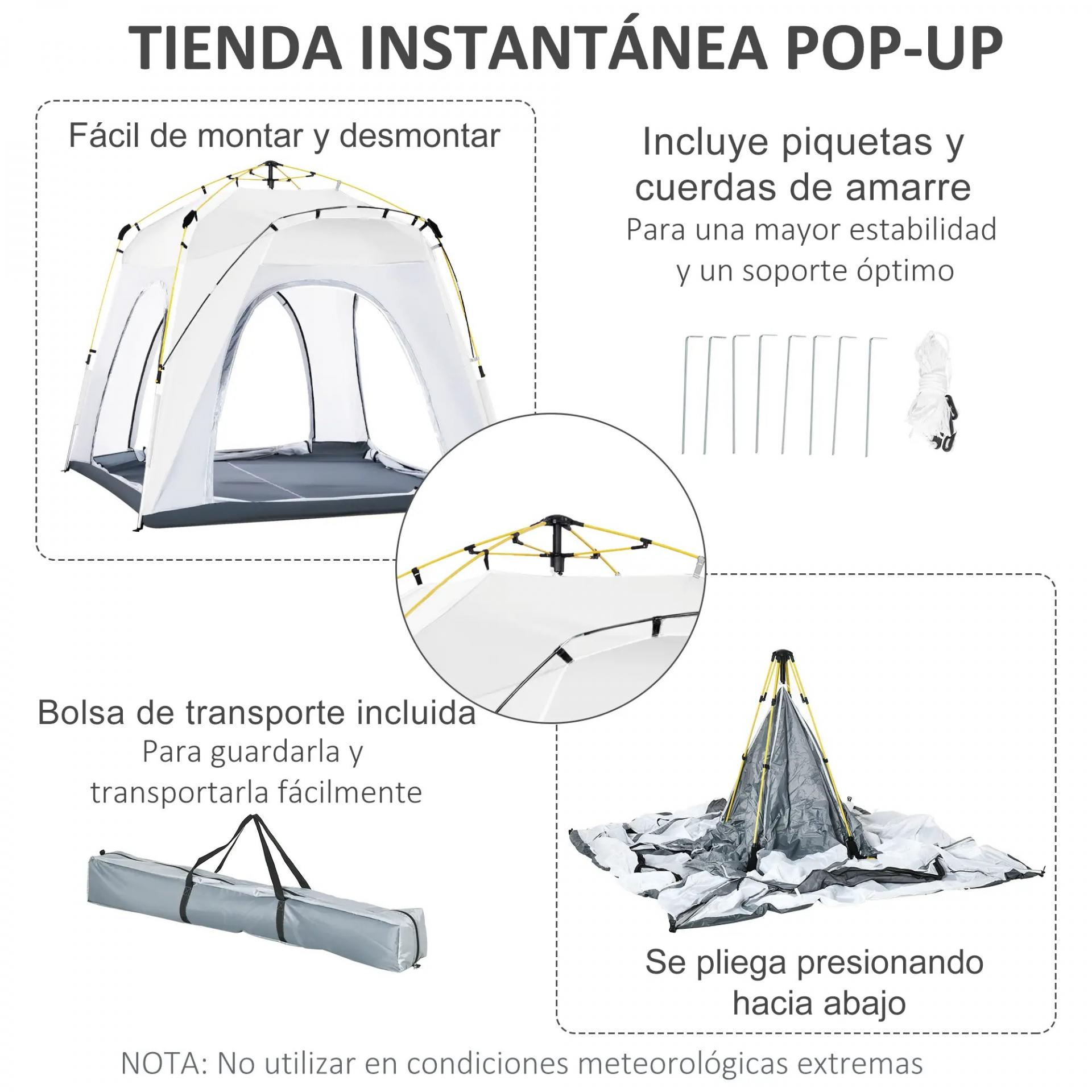 - - ACCESORIOS INCLUIDOS: Con 8 estacas de suelo de acero galvanizado, 4 cuerdas de tensión, gancho central para colgar lámpara, cobertura externa y bolsa de transporte, esta tienda de campaña te permite disfrutar al máximo de tus actividades al aire libre. MEDIDAS TOTALES: 240x240x199 cm (LxANxAL). Requiere montaje. NOTA: Esta tienda no es adecuada para condiciones climáticas adversas, no la utilices en caso de vientos, lluvia o nieve