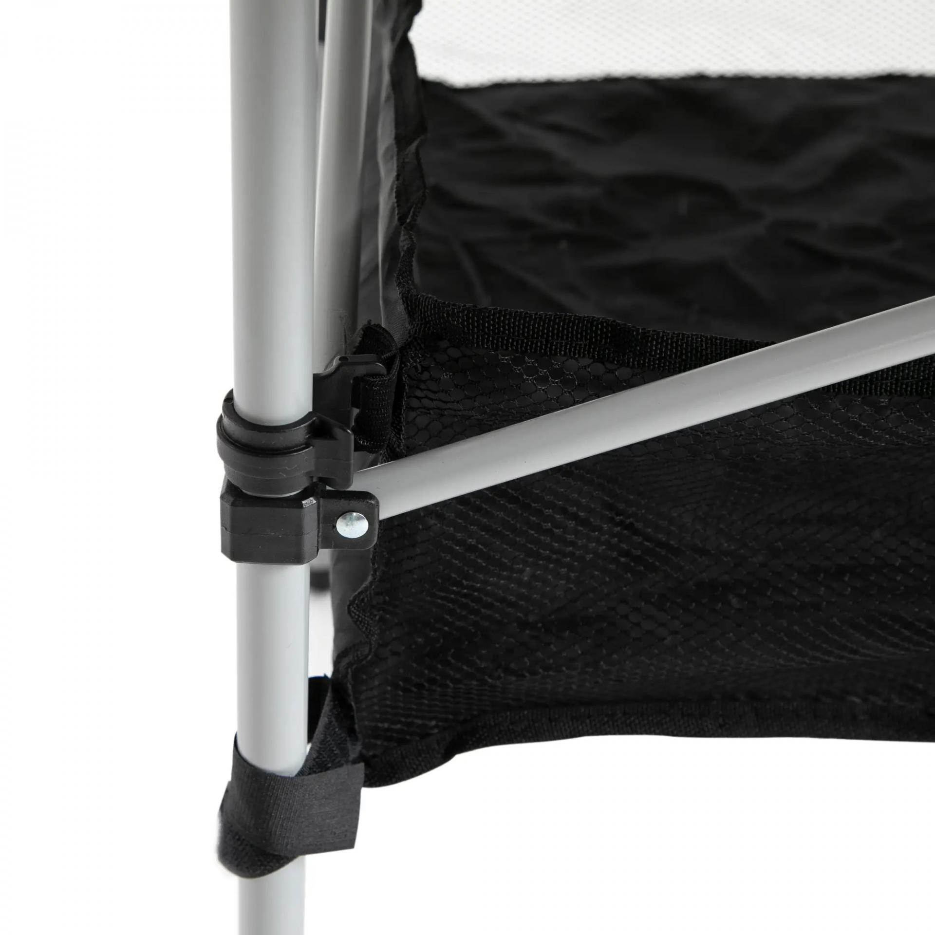- - COMPARTIMENTO INFERIOR: Esta mesa de playa cuenta con un espacio inferior de almacenaje de malla, ideal para guardar juegos, revistas... para tenerlo todo recogido cuando se le quiera dar un uso distinto a la mesa, como para comer en ella