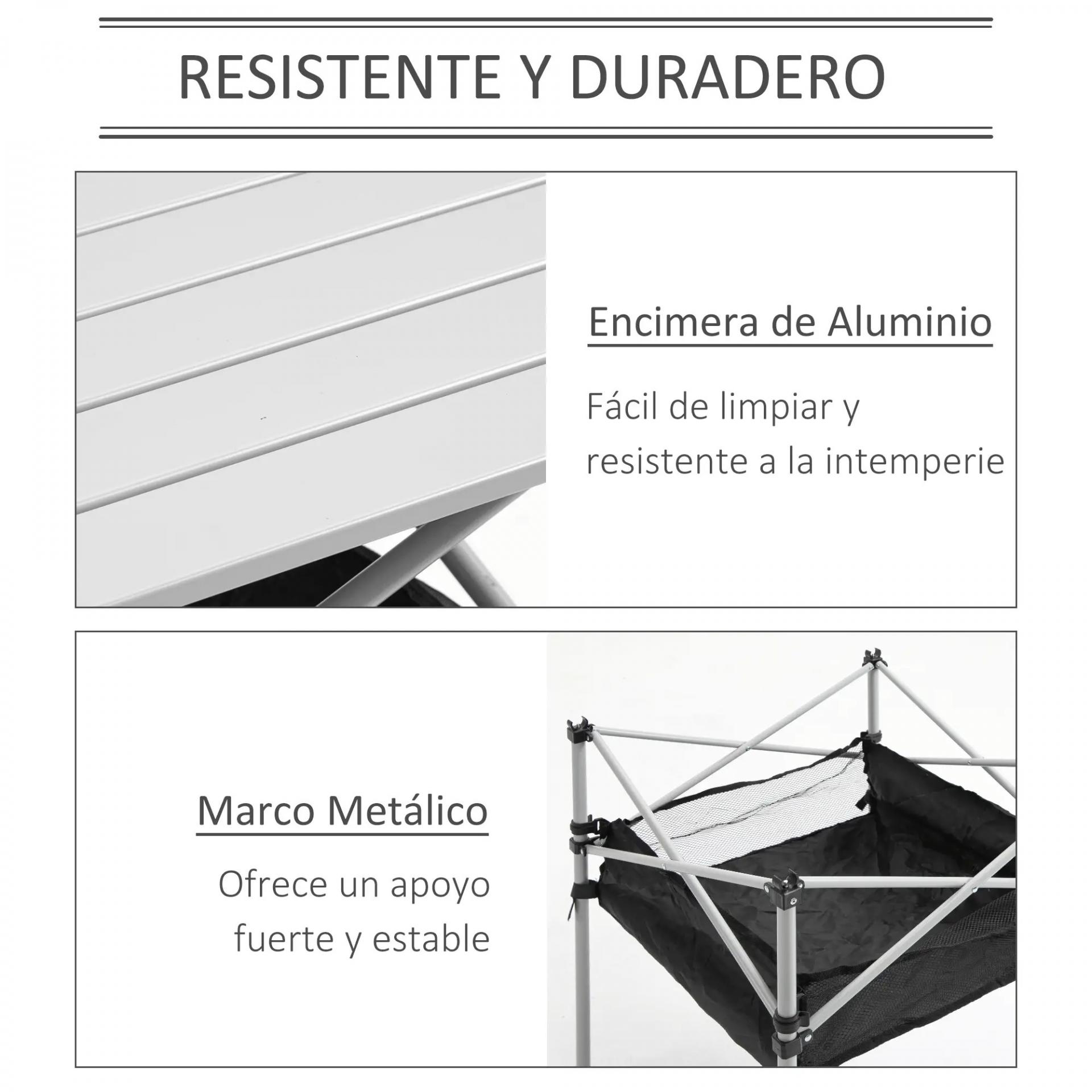 - - RESISTENTE: Mesa de camping plegable de aluminio con encimera enrollable y recubrimiento en polvo, resistente a la intemperie, la corrosión y las rayaduras. Su estructura en X mejora la estabilidad y los pies antideslizantes aseguran un uso firme. Fácil de limpiar y mantener