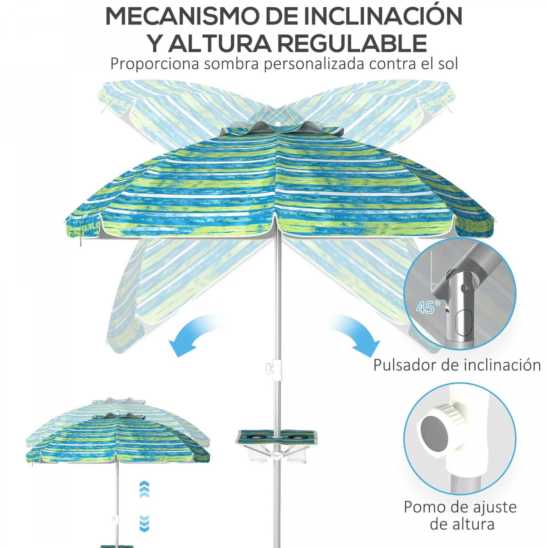 Sombrilla de Playa Ø190x215 cm con Reclinación 45° Altura Ajustable y Mesa con Portavasos Anti-UV Impermeable Multicolor
