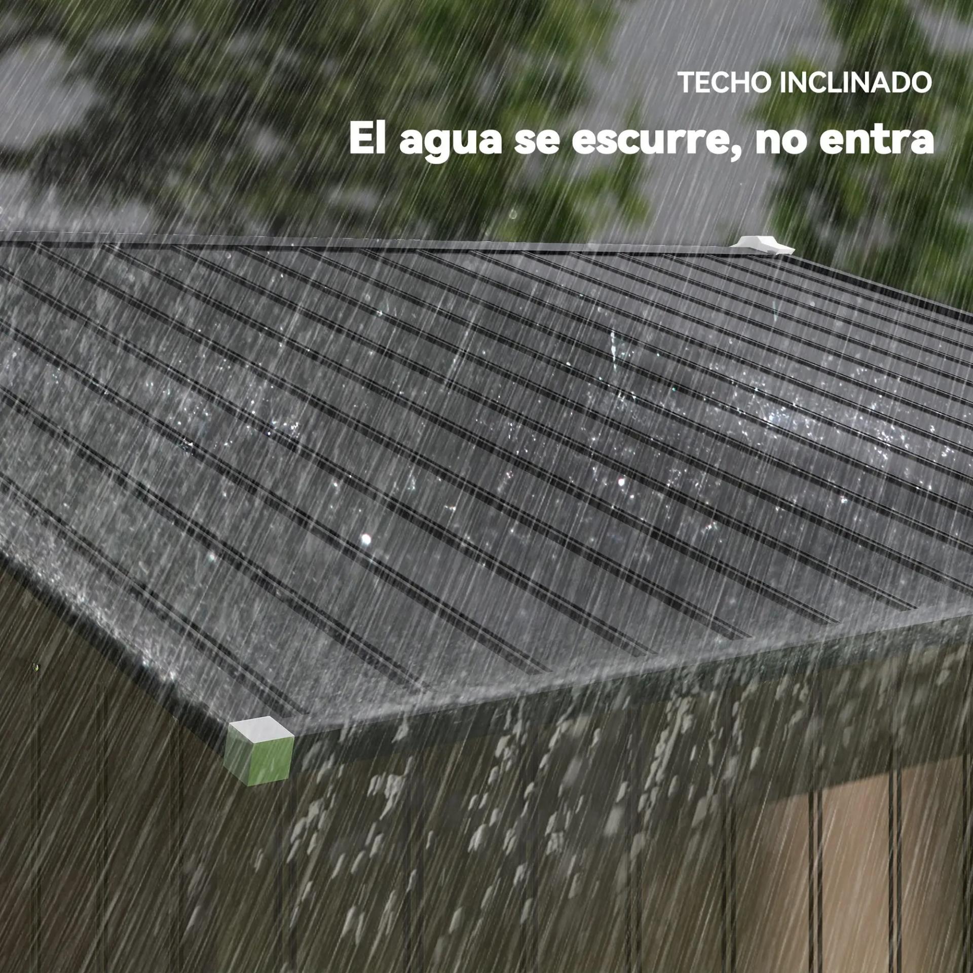 - - TECHO INCLINADO Y VENTILACIÓN: El diseño inclinado de la caseta exterior facilita el drenaje del agua y evita acumulaciones que causan corrosión. Sus cuatro rejillas de ventilación mejoran la circulación del aire y reducen la humedad interior