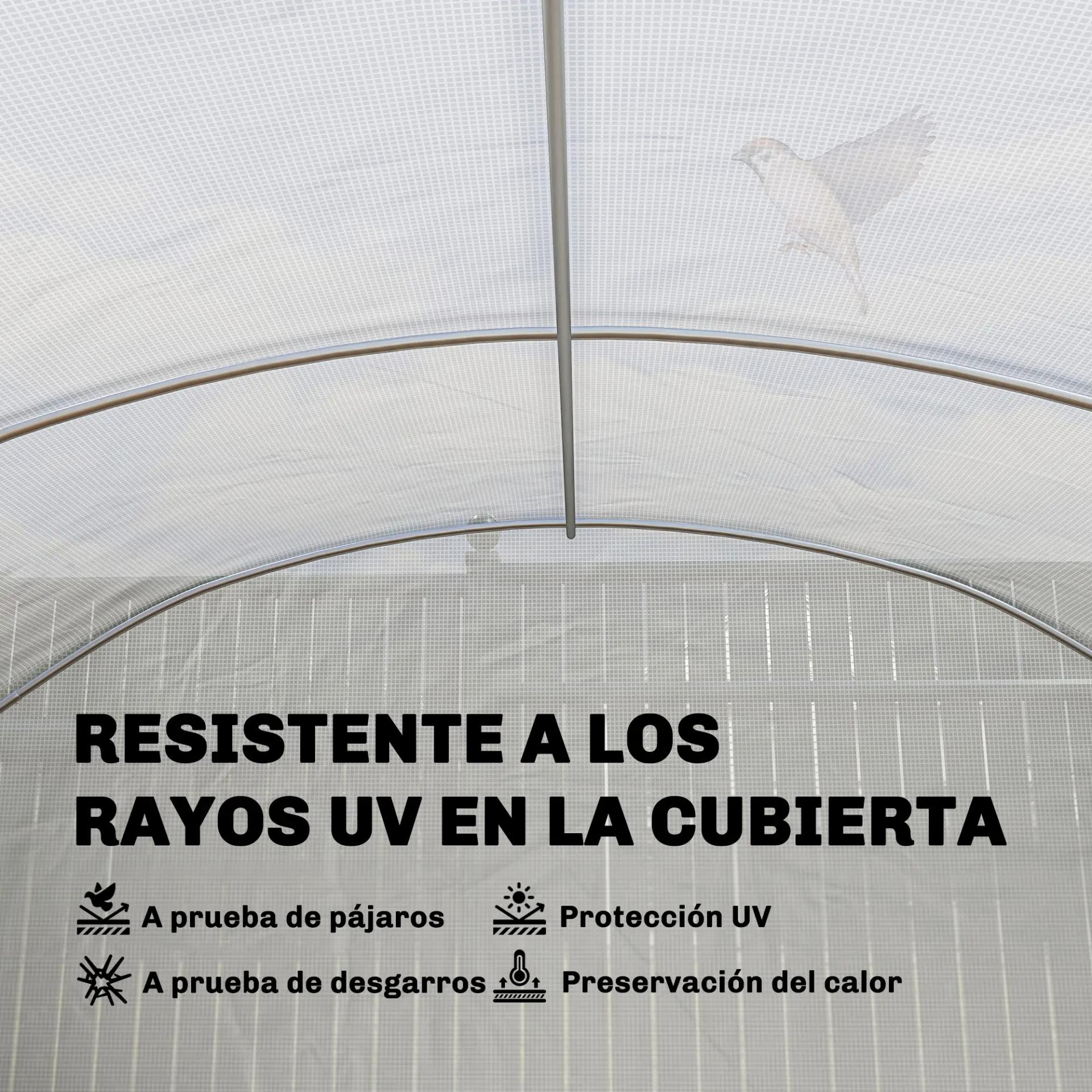 - - CUBIERTA DE PLÁSTICO DE 140 GSM: El invernadero de exterior cuenta con una cubierta de PE de 140 gsm con rejilla interna que refuerza la protección. Es resistente a rayos UV y crea un entorno estable para favorecer el crecimiento de las plantas