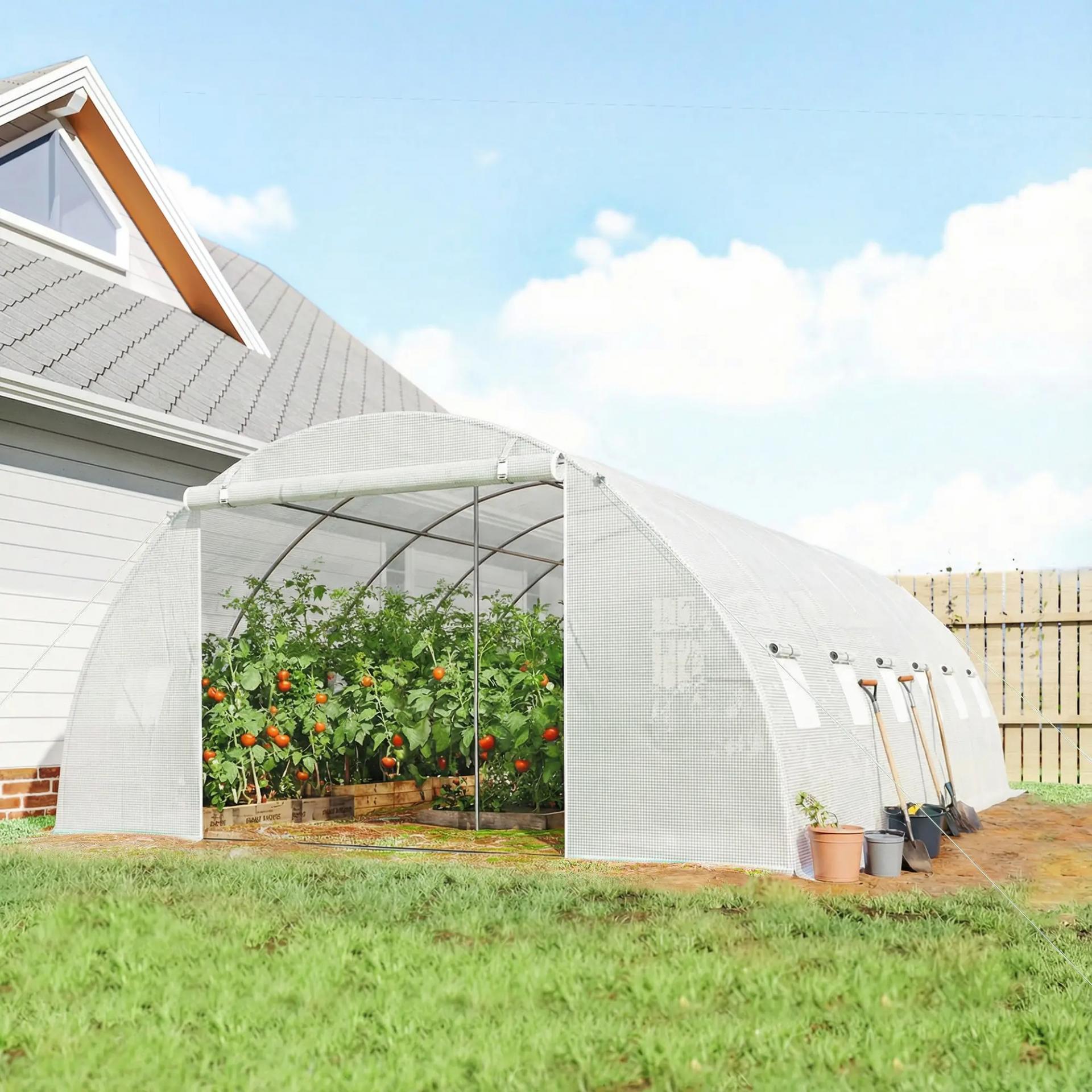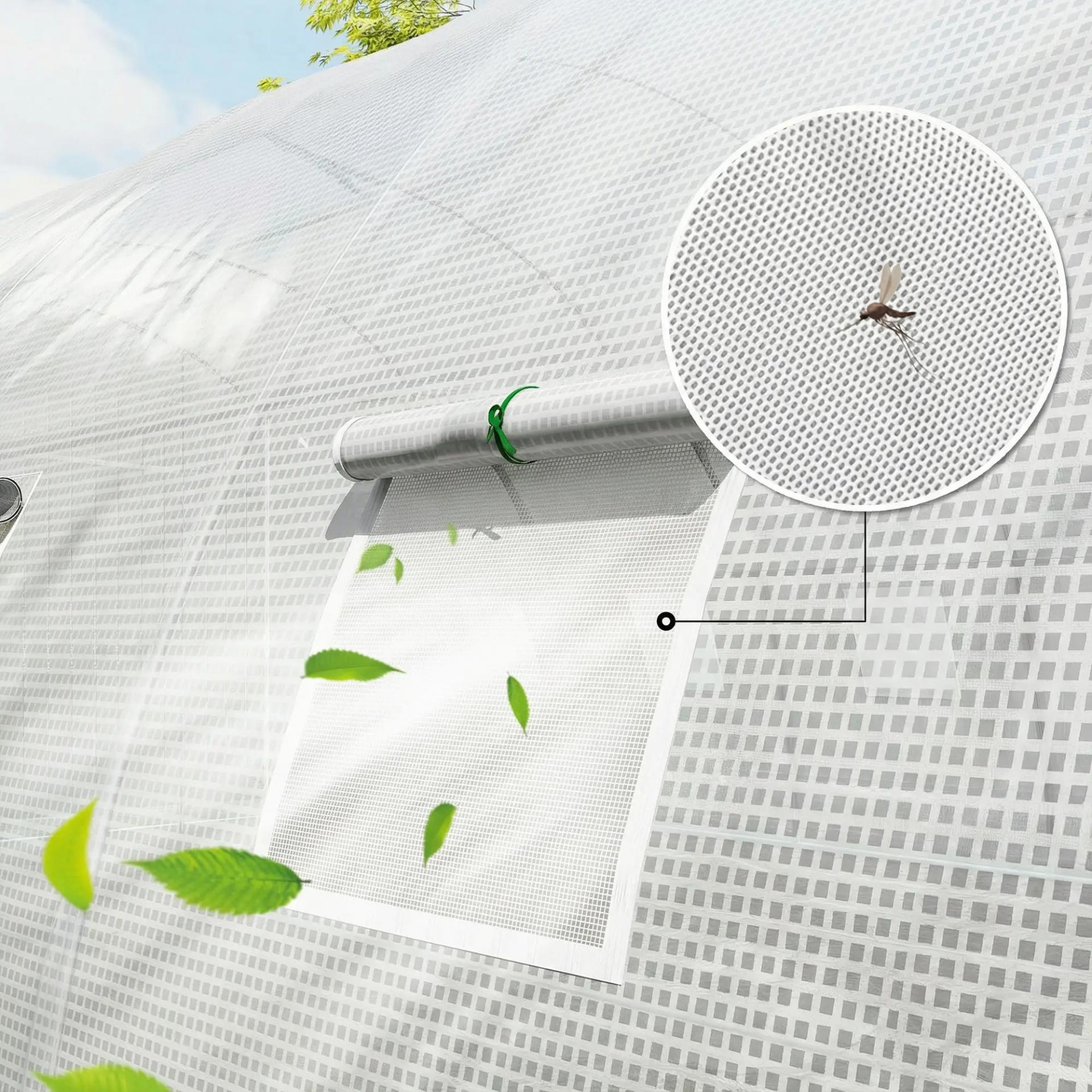 Invernadero de Túnel con 2 Varillas de Soporte 2 Puertas Enrollables y Ventanas de Malla Cubierta de PE Anti-UV Blanco